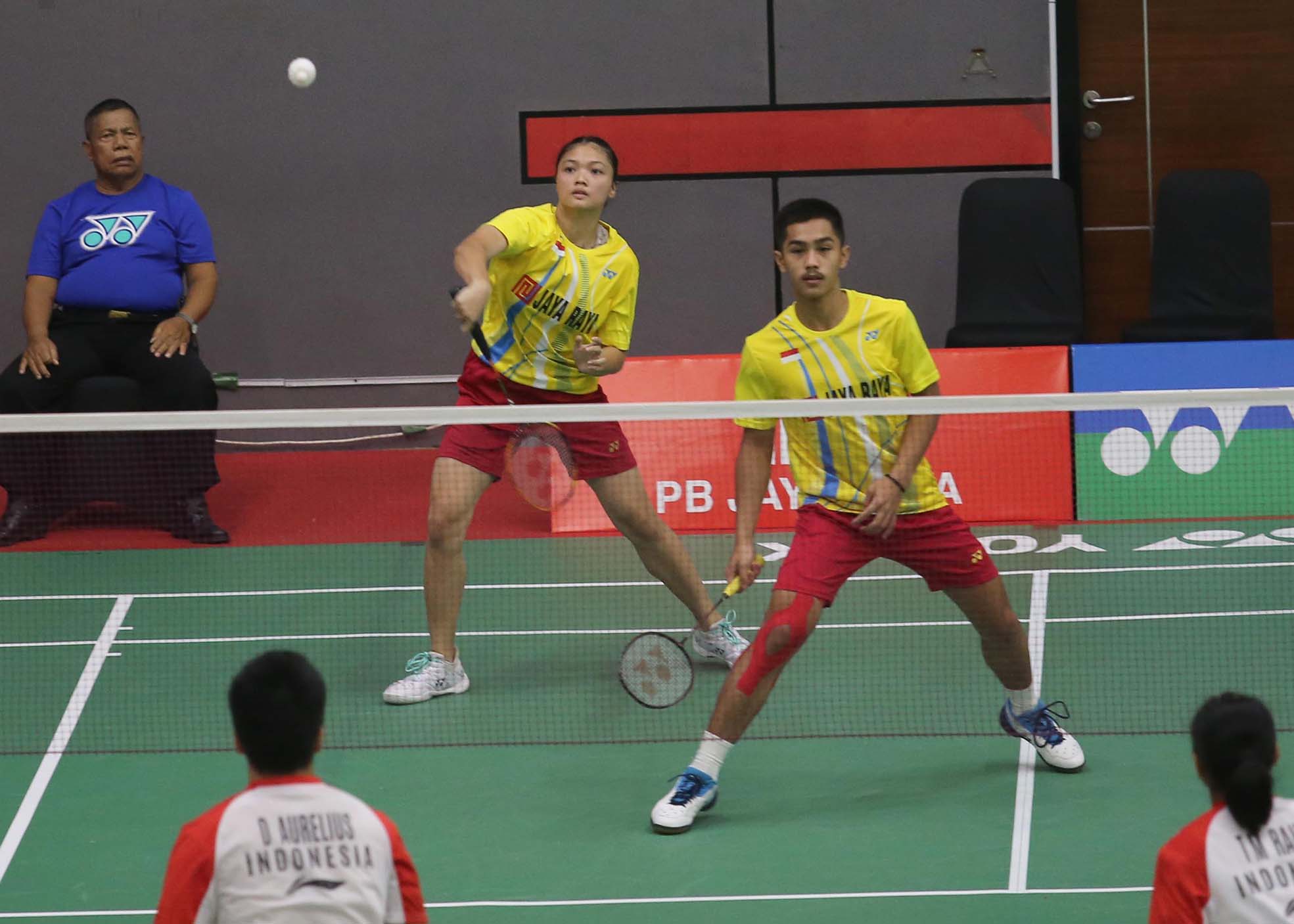 Aksi Zidane Attauba Efendi Chelsea Putri Mairera Sensa atlet Ganda Campuran Jaya Raya U15 Yonex Sunrise Pembangunan Jaya Raya Junior Internasional Grand Prix 2023. Gor Jaya Raya Bintaro, Tangerang Selatan 20/7/2023