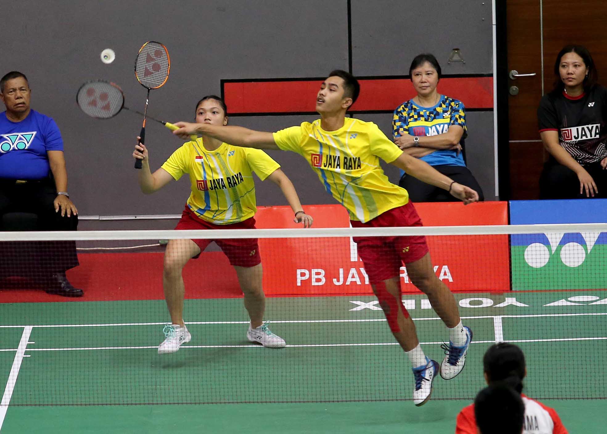 Aksi Zidane Attauba Efendi Chelsea Putri Mairera Sensa atlet Ganda Campuran Jaya Raya U15 Yonex Sunrise Pembangunan Jaya Raya Junior Internasional Grand Prix 2023. Gor Jaya Raya Bintaro, Tangerang Selatan 20/7/2023