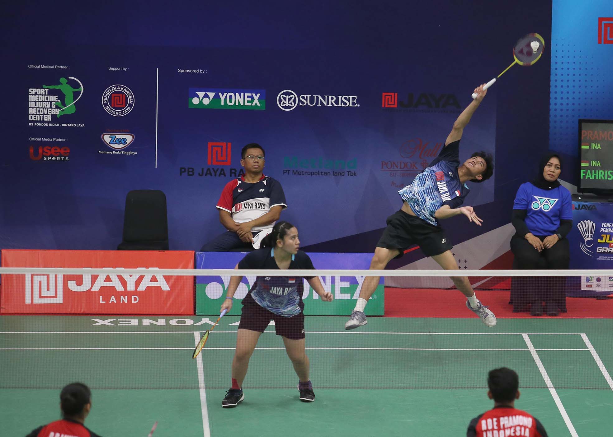 Aksi Raihan Daffa Edsel Pramono dan Dian Ramadhani Mukti atlet Ganda Campuran Jaya Raya U17 Yonex Sunrise Pembangunan Jaya Raya Junior Internasional Grand Prix 2023. Gor Jaya Raya Bintaro, Tangerang Selatan 20/7/2023