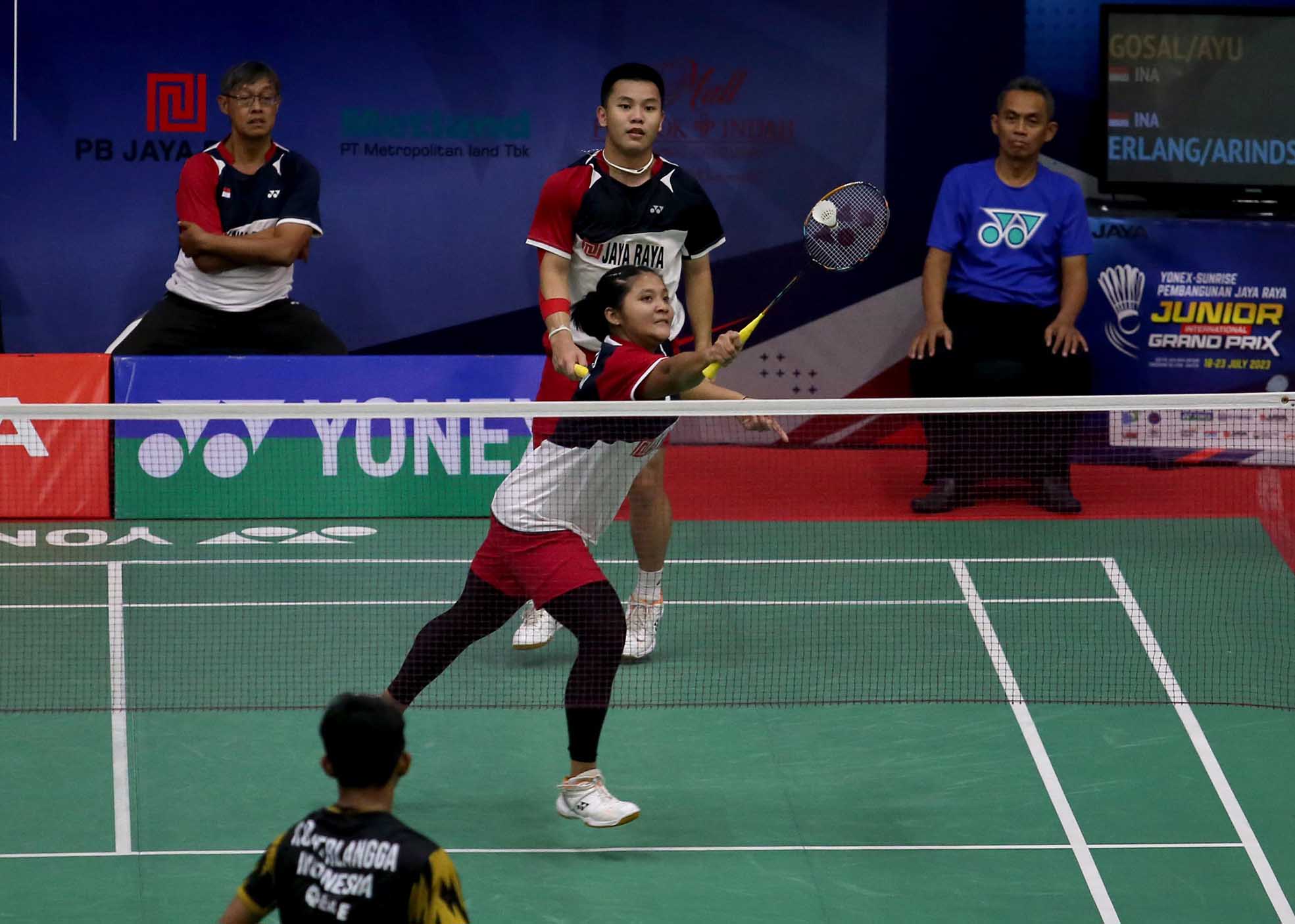 Aksi Jonathan Farrell Gosal-Nabila Cahya Permata Ayu atlet Ganda Campuran Jaya Raya U19 Yonex Sunrise Pembangunan Jaya Raya Junior Internasional Grand Prix 2023. Gor Jaya Raya Bintaro, Tangerang Selatan 20/7/2023