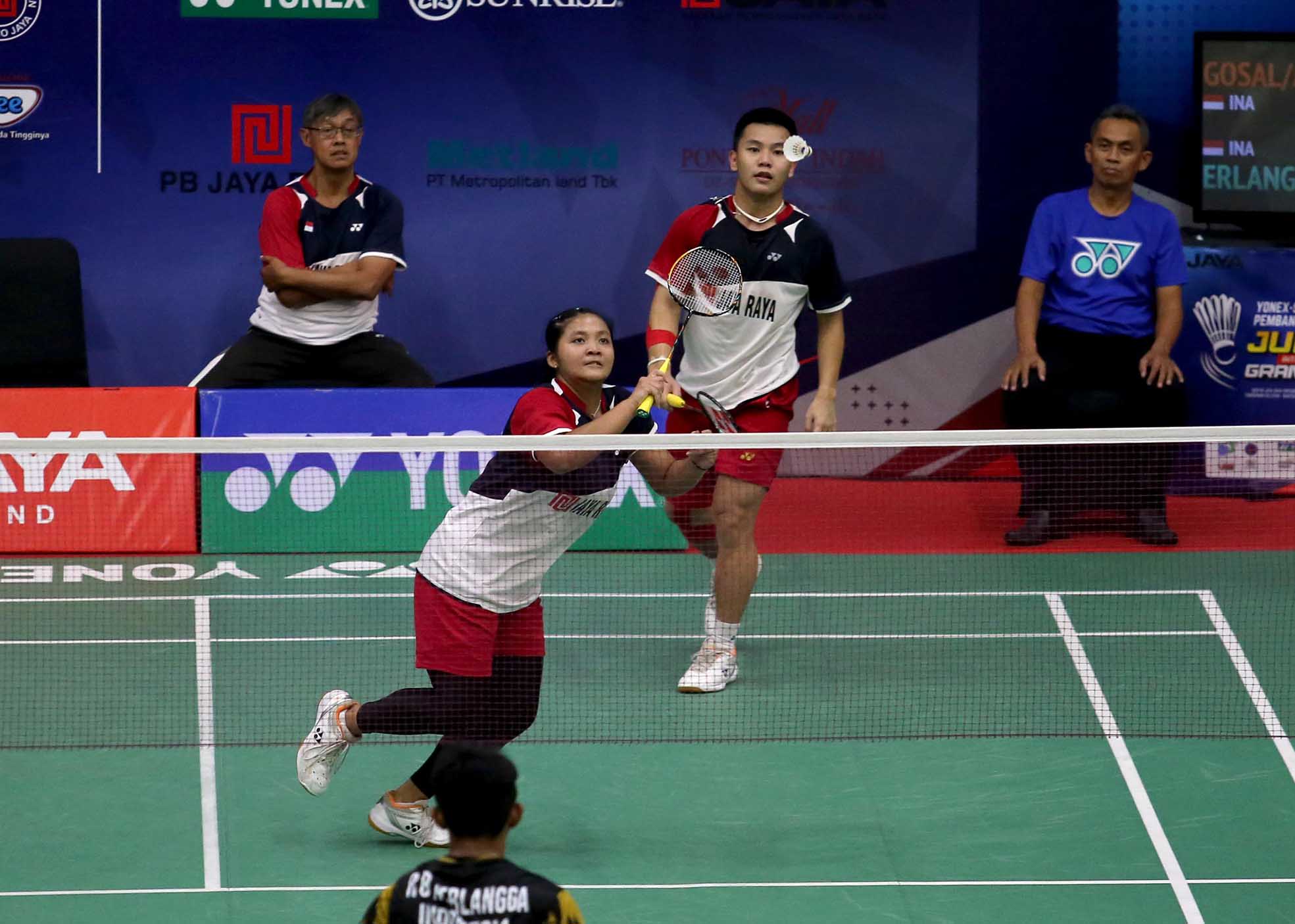 Aksi Jonathan Farrell Gosal-Nabila Cahya Permata Ayu atlet Ganda Campuran Jaya Raya U19 Yonex Sunrise Pembangunan Jaya Raya Junior Internasional Grand Prix 2023. Gor Jaya Raya Bintaro, Tangerang Selatan 20/7/2023