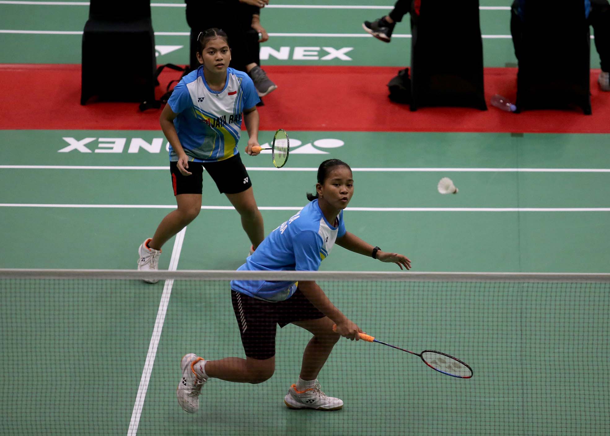 Aksi Mellynda Dwi Octavya-Nadhifa Nur Zahra atlet Ganda Putri Jaya Raya U19 Yonex Sunrise Pembangunan Jaya Raya Junior Internasional Grand Prix 2023. Gor Jaya Raya Bintaro, Tangerang Selatan 20/7/2023