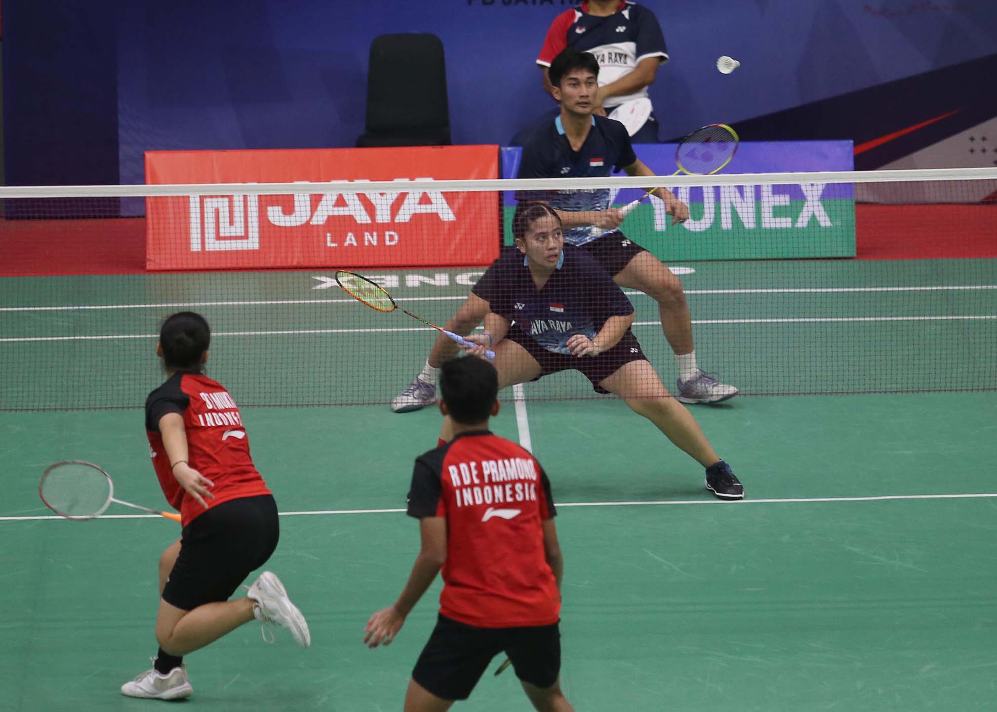 Aksi Raihan Daffa Edsel Pramono dan Dian Ramadhani Mukti atlet Ganda Campuran Jaya Raya U17 Yonex Sunrise Pembangunan Jaya Raya Junior Internasional Grand Prix 2023. Gor Jaya Raya Bintaro, Tangerang Selatan 20/7/2023