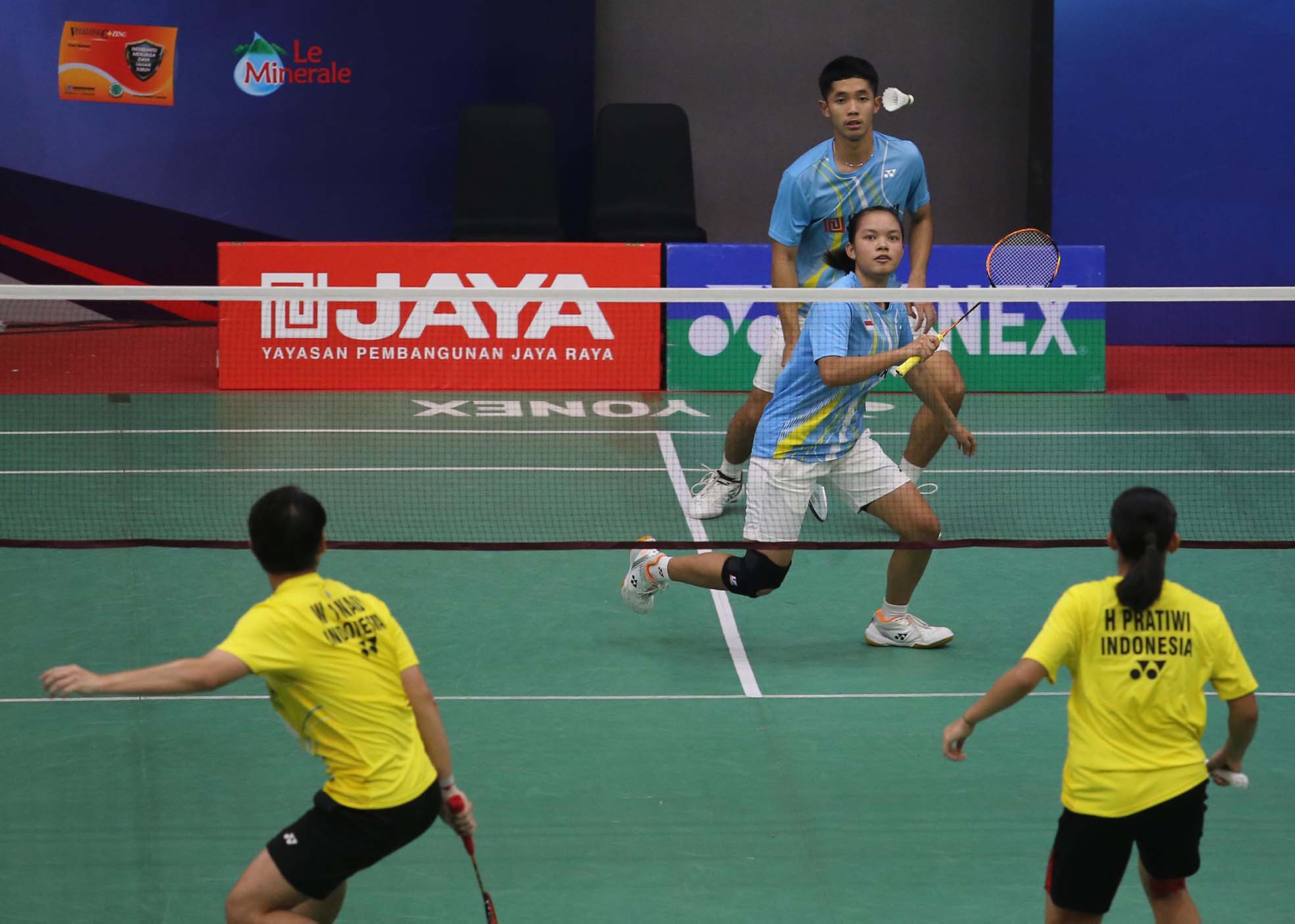 Aksi Adrian Pratama-Ariella Naqiyyah atlet Ganda Campuran Jaya Raya U19 Yonex Sunrise Pembangunan Jaya Raya Junior Internasional Grand Prix 2023. Gor Jaya Raya Bintaro, Tangerang Selatan 20/7/2023