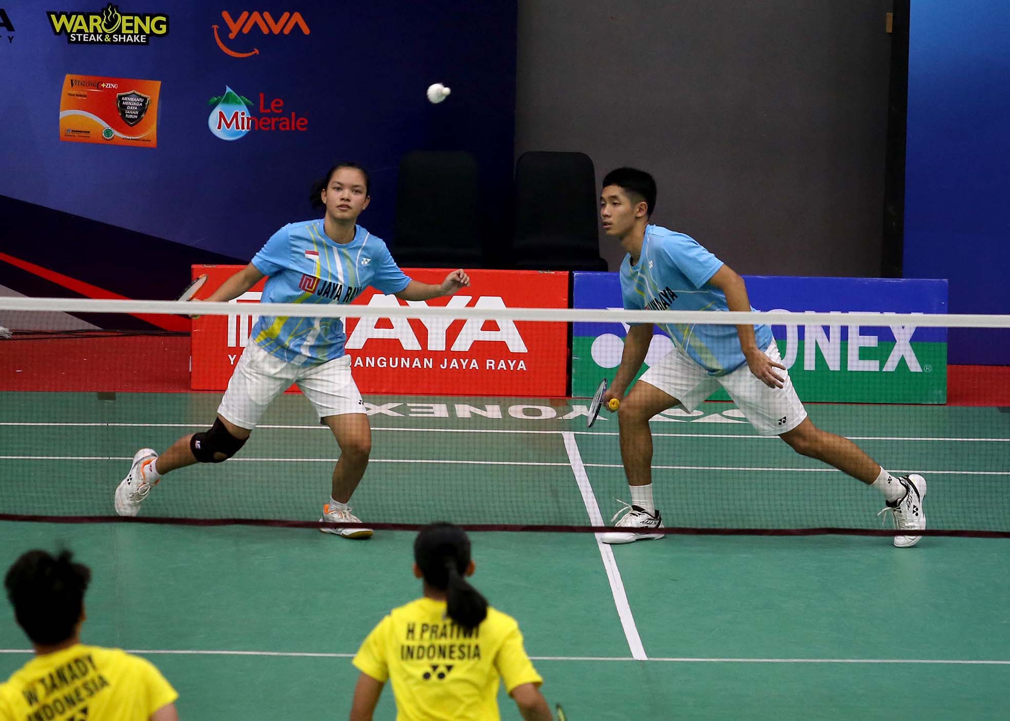Aksi Adrian Pratama-Ariella Naqiyyah atlet Ganda Campuran Jaya Raya U19 Yonex Sunrise Pembangunan Jaya Raya Junior Internasional Grand Prix 2023. Gor Jaya Raya Bintaro, Tangerang Selatan 20/7/2023