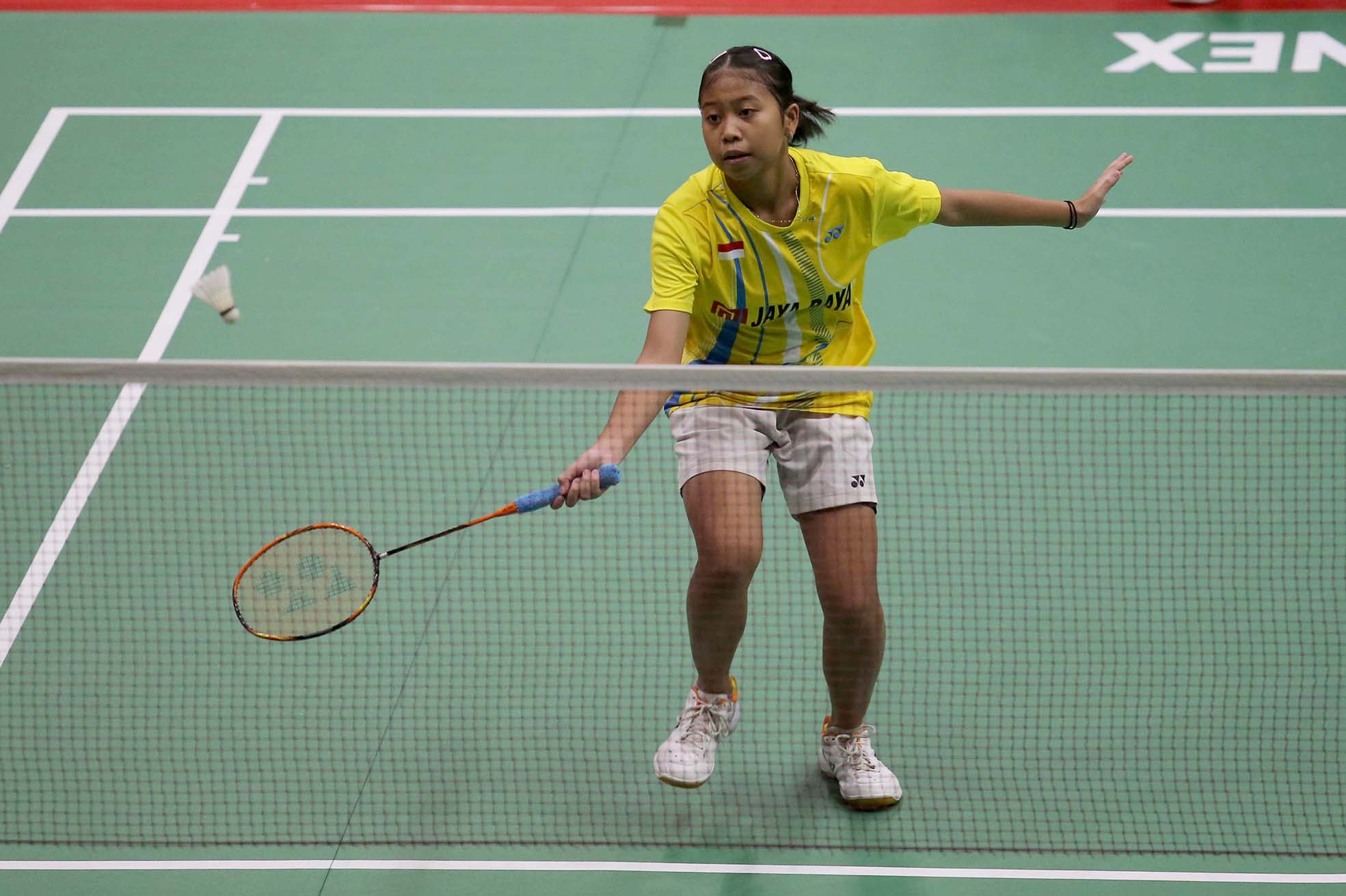 Aksi Rhesti Fuji Ardina atlet Tunggal Putri Jaya Raya U15 Yonex Sunrise Pembangunan Jaya Raya Junior Internasional Grand Prix 2023 yang berlangsung di GOR Jaya Raya Bintaro, Tangerang Selatan 20/7/2023