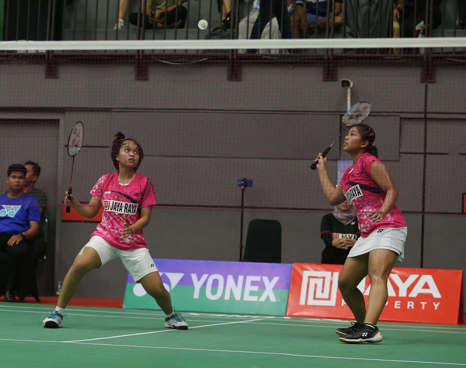 Aksi Ainun Qomariah-Nur Aliah Rahma atlet Ganda Putri Jaya Raya U17 Yonex Sunrise Pembangunan Jaya Raya Junior Internasional Grand Prix 2023. Gor Jaya Raya Bintaro, Tangerang Selatan 21/7/2023