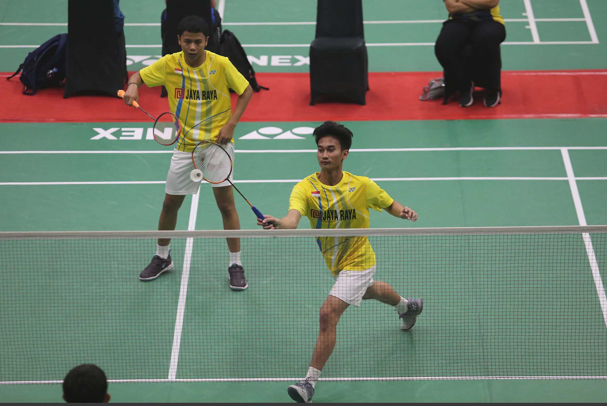 Aksi Helmi Fatih Fahrissalam-M Raffy Raffael Hernanda atlet Ganda Putra Jaya Raya U17 Yonex Sunrise Pembangunan Jaya Raya Junior Internasional Grand Prix 2023. Gor Jaya Raya Bintaro, Tangerang Selatan 20/7/2023