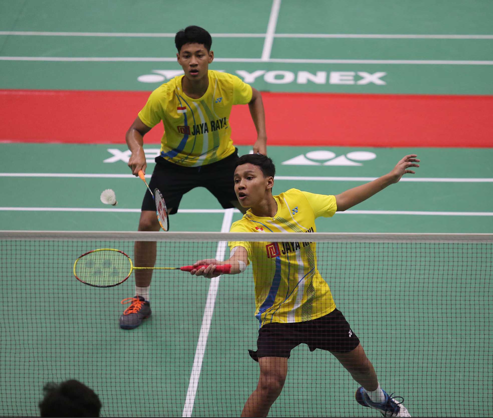 Aksi Je Ryco Bachtiar-Mahesa Agung Sedayu atlet Ganda Putra Jaya Raya U17 Yonex Sunrise Pembangunan Jaya Raya Junior Internasional Grand Prix 2023. Gor Jaya Raya Bintaro, Tangerang Selatan 20/7/2023