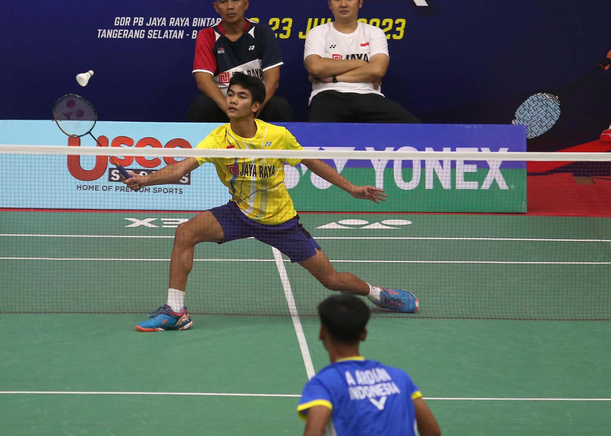 Aksi Jevan Bennet Seleky atlet Tunggal Putra Jaya Raya U15 Yonex Sunrise Pembangunan Jaya Raya Junior Internasional Grand Prix 2023. Gor Jaya Raya Bintaro, Tangerang Selatan 20/7/2023