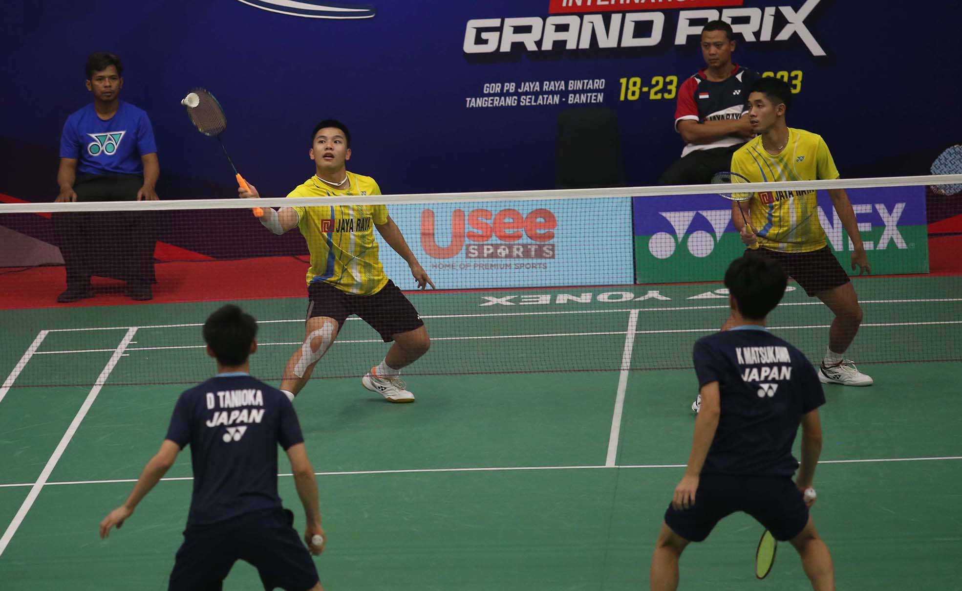 Aksi Jonathan Farrel Gosal-Adrian Pratama Hernanda atlet Ganda Putra Jaya Raya U19 Yonex Sunrise Pembangunan Jaya Raya Junior Internasional Grand Prix 2023. Gor Jaya Raya Bintaro, Tangerang Selatan 20/7/2023