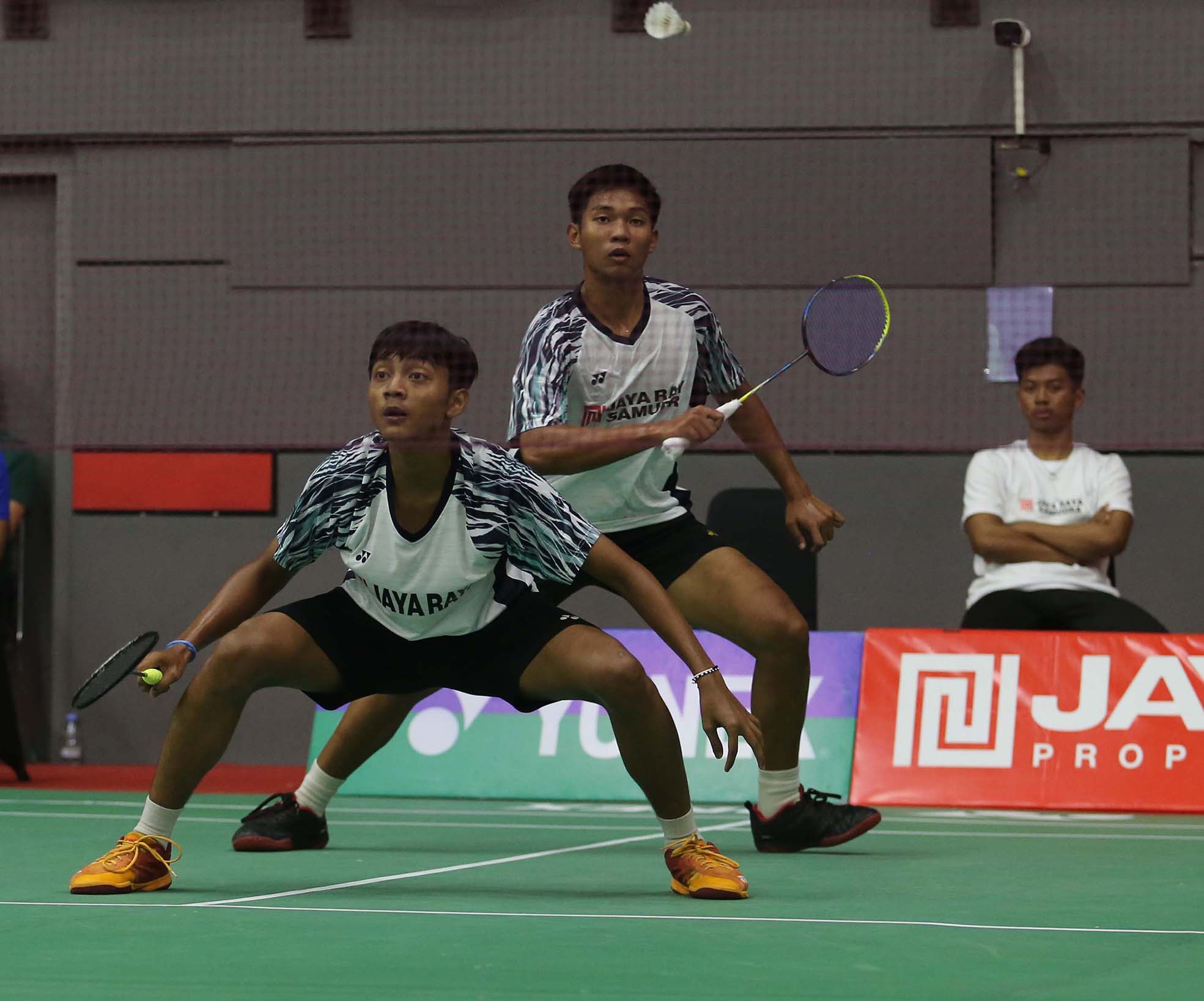Aksi Muhammad Vito Annafsa-Gianlugi Pasha Arief( atlet Ganda Putra Jaya Raya U17 Yonex Sunrise Pembangunan Jaya Raya Junior Internasional Grand Prix 2023. Gor Jaya Raya Bintaro, Tangerang Selatan 20/7/2023