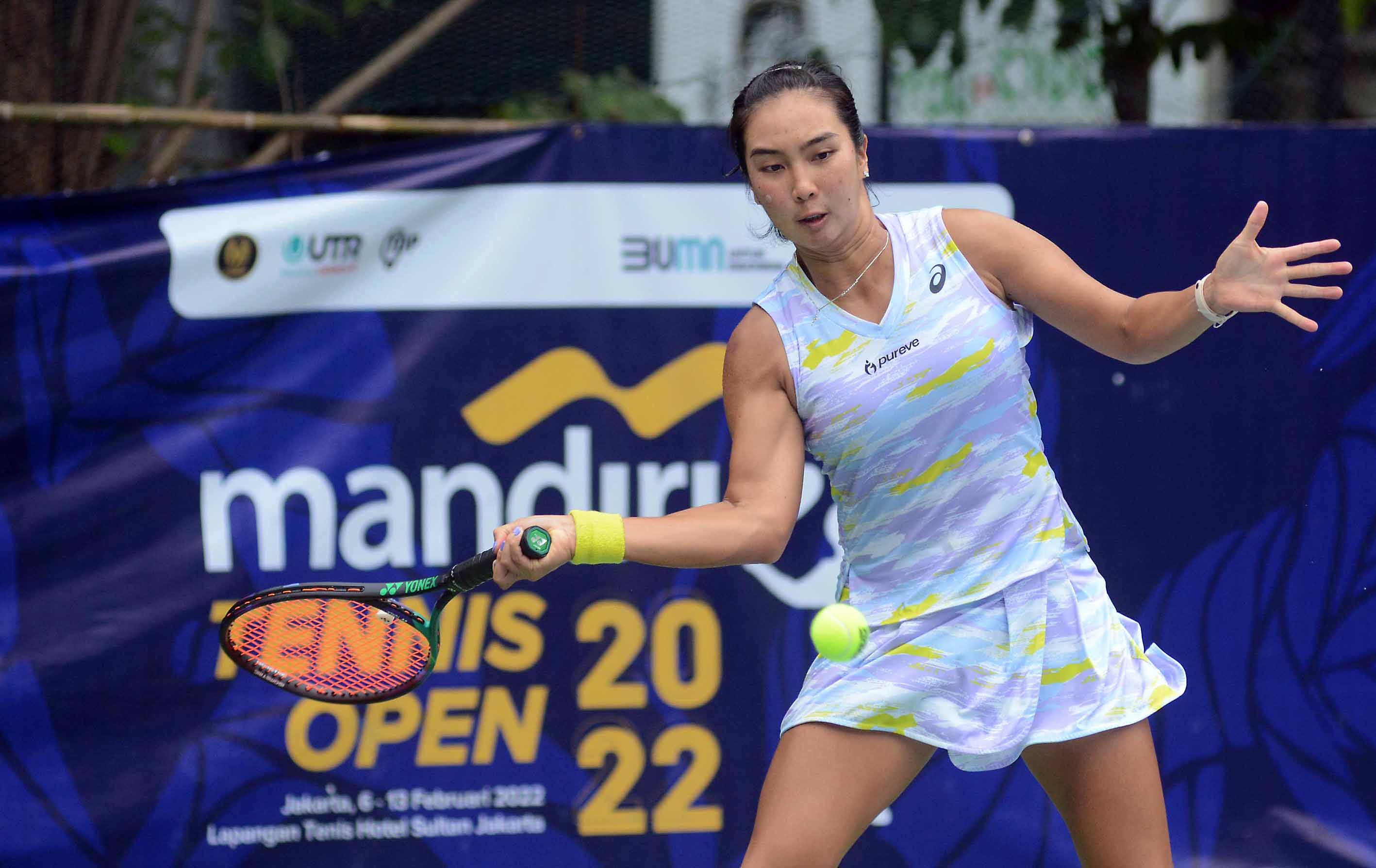 Petenis Jawa Timur, Aldila Sutjiadi dalam pertandingan babak kedua turnamen nasional Mandiri Tennis Open 2022 di lapangan tenis The Sultan Hotel & Residence Jakarta, Kamis, 10 Februari 2022.