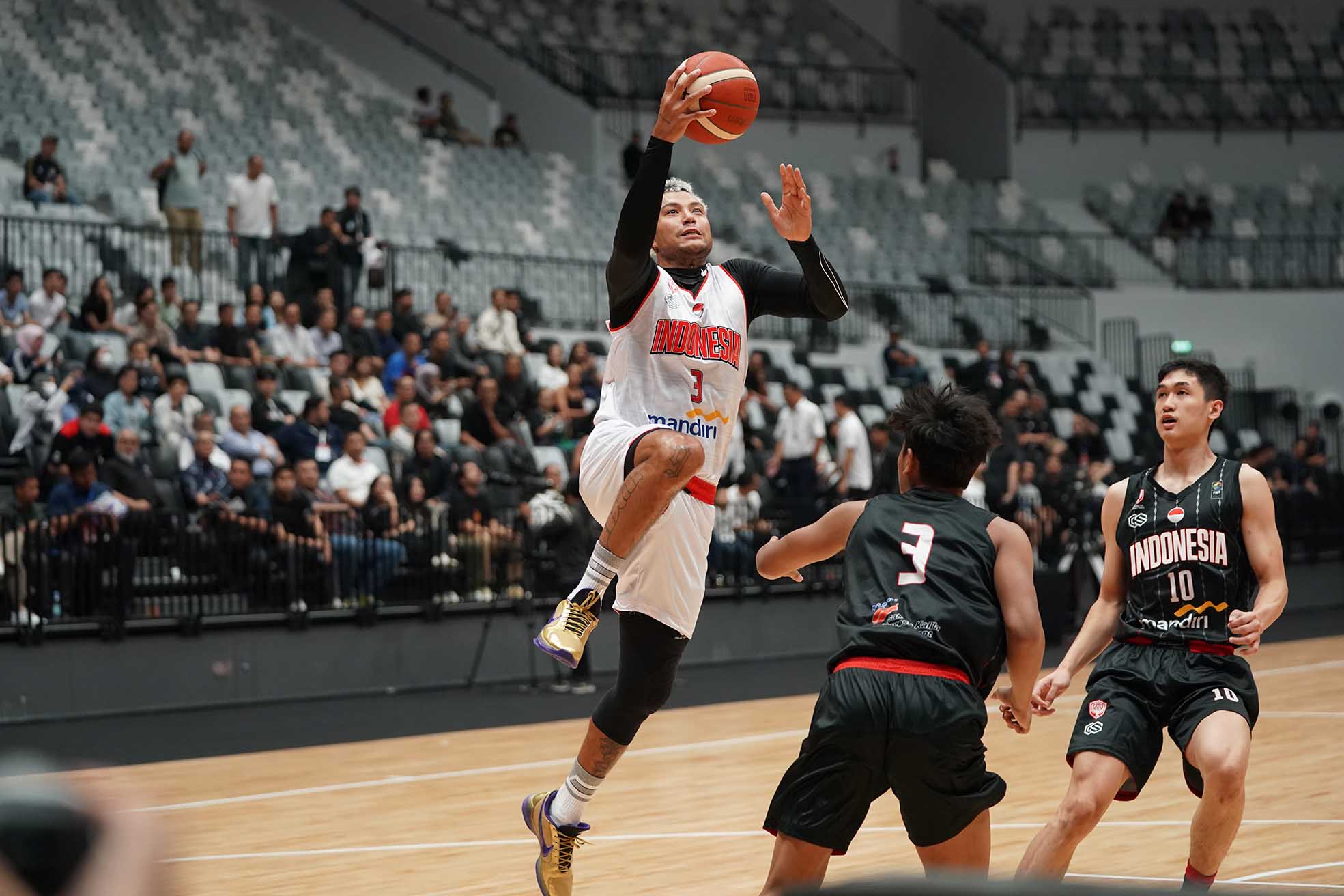 Brandon Van Dorn Jawato, dalam aksinya di Timnas bola basket Indonesia di Indonesia International Basketball Invitational (IIBI) saat melawan juniornya Indonesia Patriots. Timnas Bola Basket mengalahkan Patriots 82-56 di Indonesia Arena, Gelora Bung Karno Senayan, Jakarta, Rabu (2/8/2023) petang.