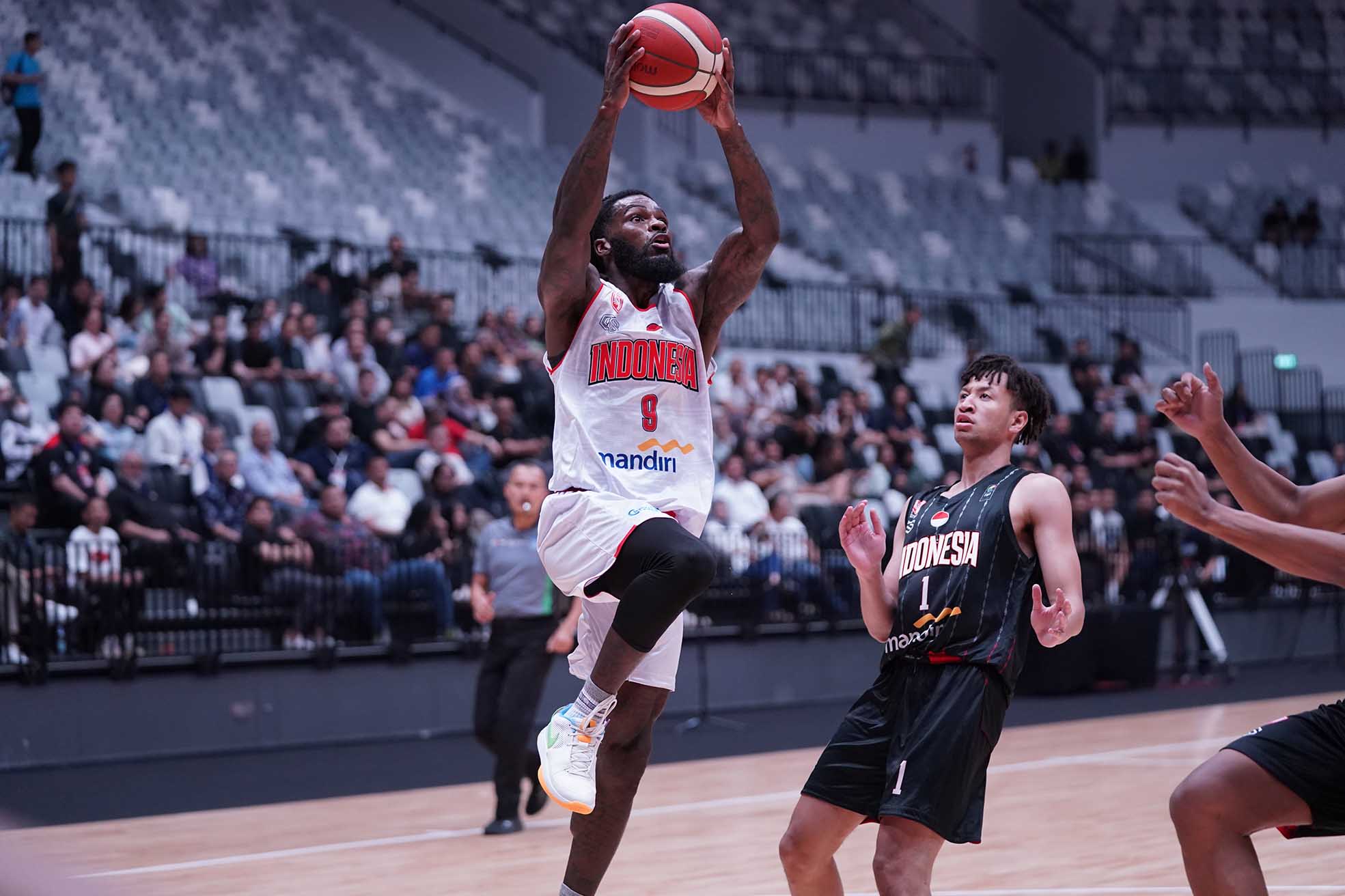 Jerome Anthony Beane Jr, dalam aksinya di Timnas bola basket Indonesia di Indonesia International Basketball Invitational (IIBI) saat melawan juniornya Indonesia Patriots. Timnas Bola Basket mengalahkan Patriots 82-56 di Indonesia Arena, Gelora Bung Karno Senayan, Jakarta, Rabu (2/8/2023) petang.