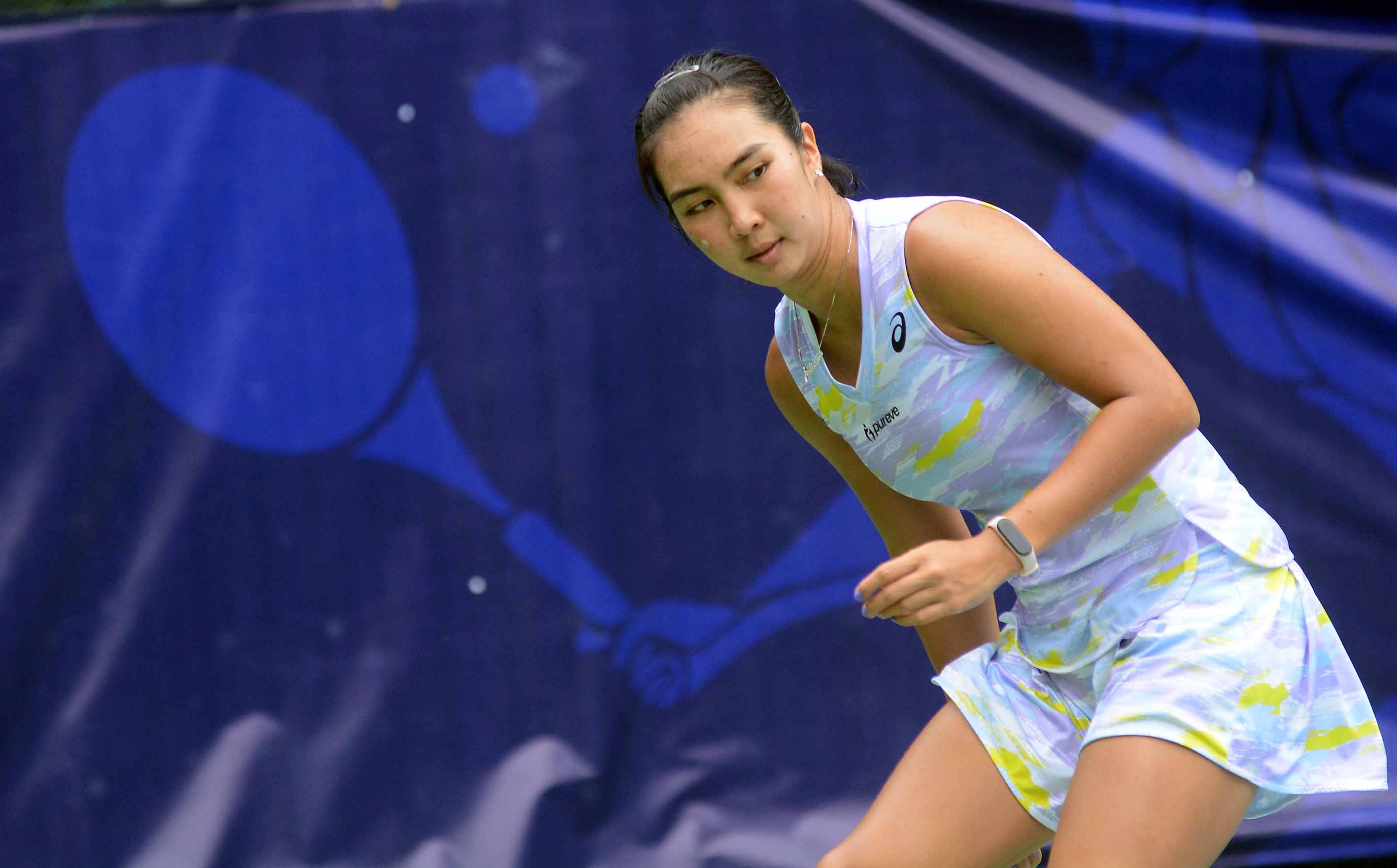 Petenis Jawa Timur, Aldila Sutjiadi dalam pertandingan babak kedua turnamen nasional Mandiri Tennis Open 2022 di lapangan tenis The Sultan Hotel & Residence Jakarta, Kamis, 10 Februari 2022.