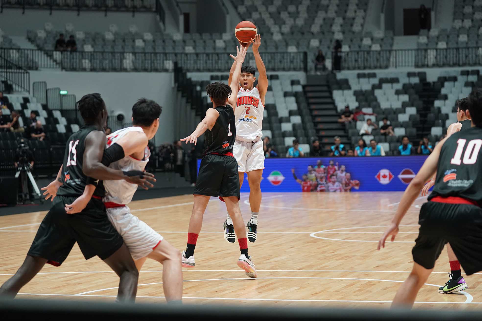 Muhamad Arighi Hadran Noor, dalam aksinya di Timnas bola basket Indonesia di Indonesia International Basketball Invitational (IIBI) saat melawan juniornya Indonesia Patriots. Timnas Bola Basket mengalahkan Patriots 82-56 di Indonesia Arena, Gelora Bung Karno Senayan, Jakarta, Rabu (2/8/2023) petang.
