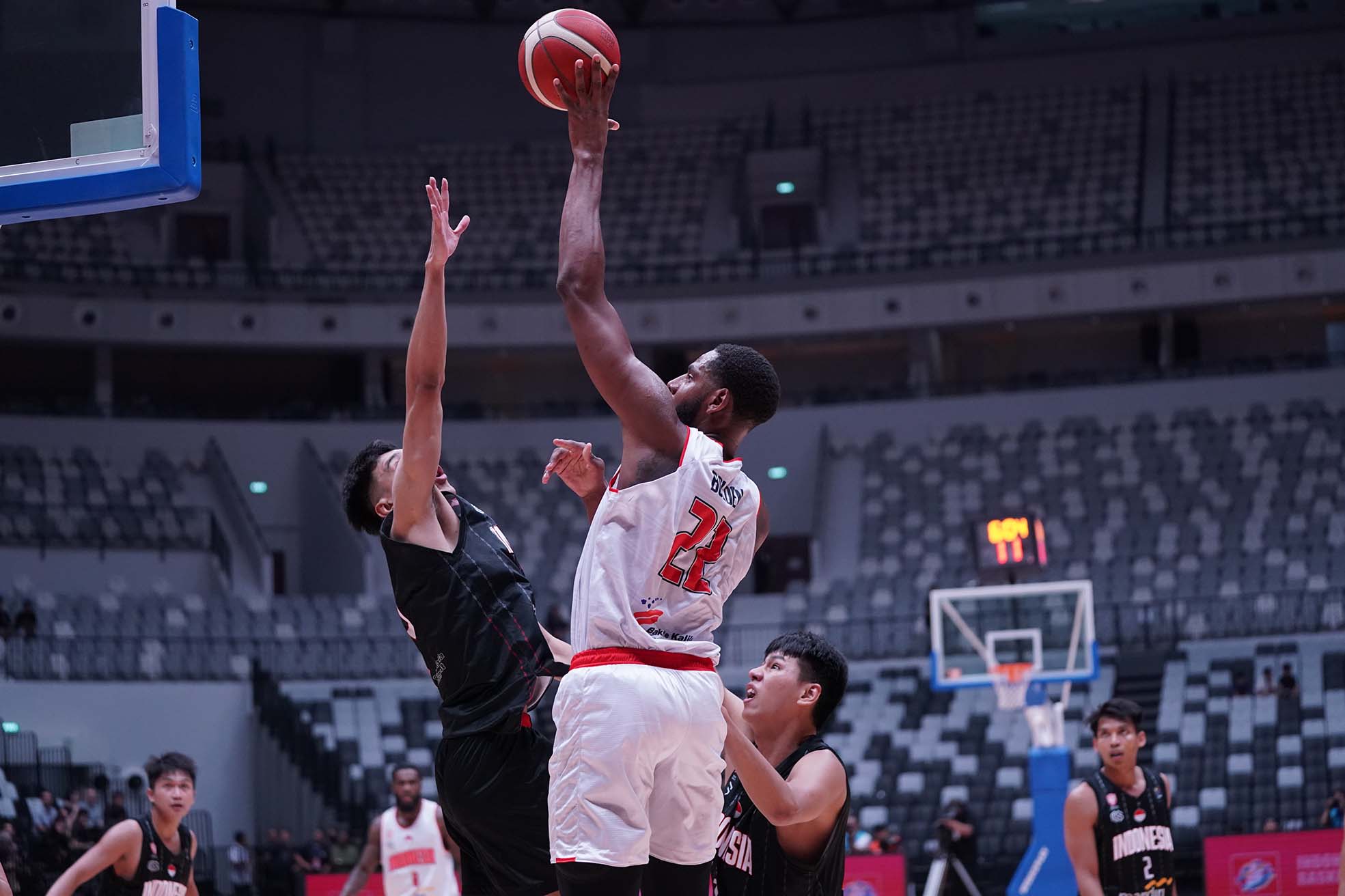 Marques Terrell Bolden, dalam aksinya di Timnas bola basket Indonesia di Indonesia International Basketball Invitational (IIBI) saat melawan juniornya Indonesia Patriots. Timnas Bola Basket mengalahkan Patriots 82-56 di Indonesia Arena, Gelora Bung Karno Senayan, Jakarta, Rabu (2/8/2023) petang.