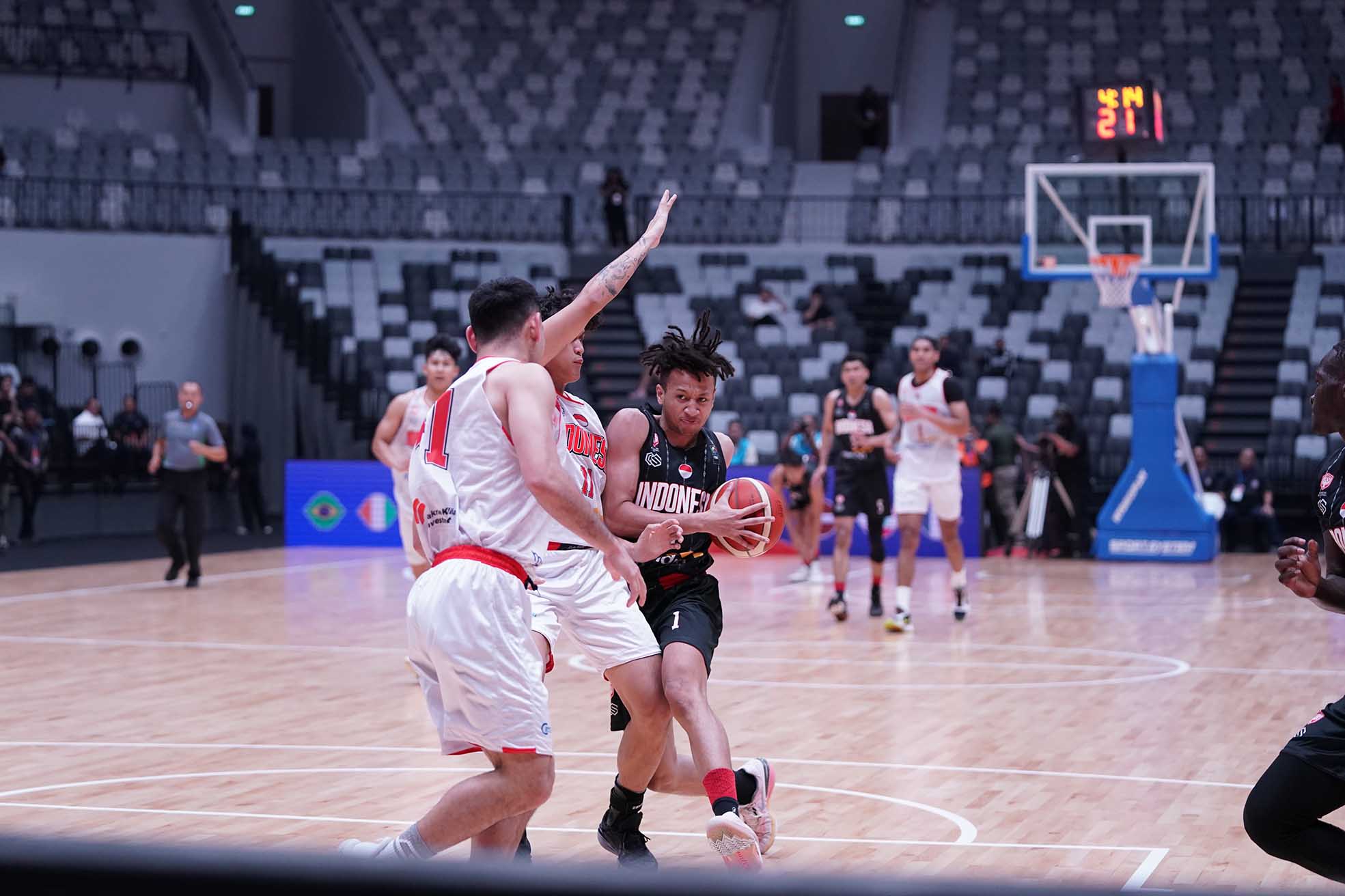 Hendrix Xavi Yonga, dalam aksinya di Timnas bola basket Indonesia di Indonesia International Basketball Invitational (IIBI) saat melawan juniornya Indonesia Patriots. Timnas Bola Basket mengalahkan Patriots 82-56 di Indonesia Arena, Gelora Bung Karno Senayan, Jakarta, Rabu (2/8/2023) petang.