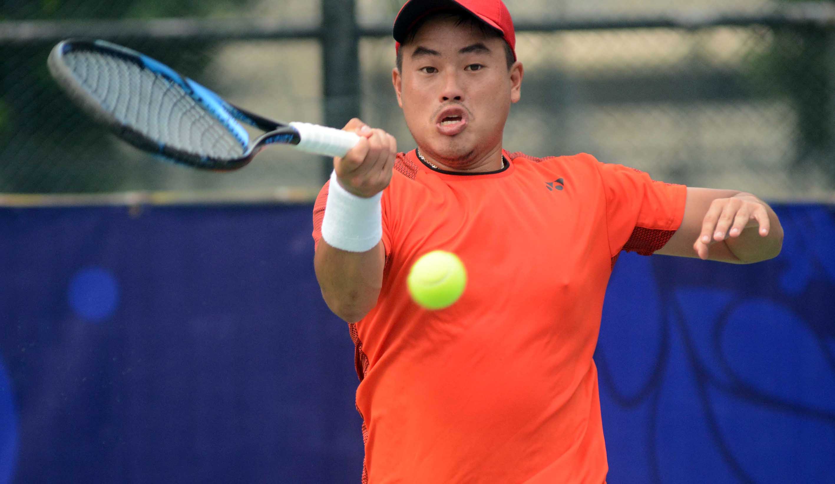 Petenis Jawa Timur, Anthony Susanto dalam pertandingan babak perempat final turnamen nasional Mandiri Tennis Open 2022 di lapangan tenis The Sultan Hotel & Residence Jakarta, Jumat, 11 Februari 2022.