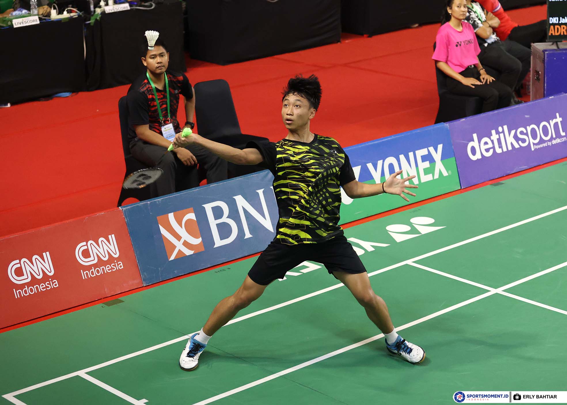 Adriel Ferdinand Leonardo (DKI Jakarta) saat bertanding di Kejuaraan Bulutangkis PBSI Perorangan tahun 2023 yang berlansung di GOR UNJ, Jakarta pada 22 Desember 2023.