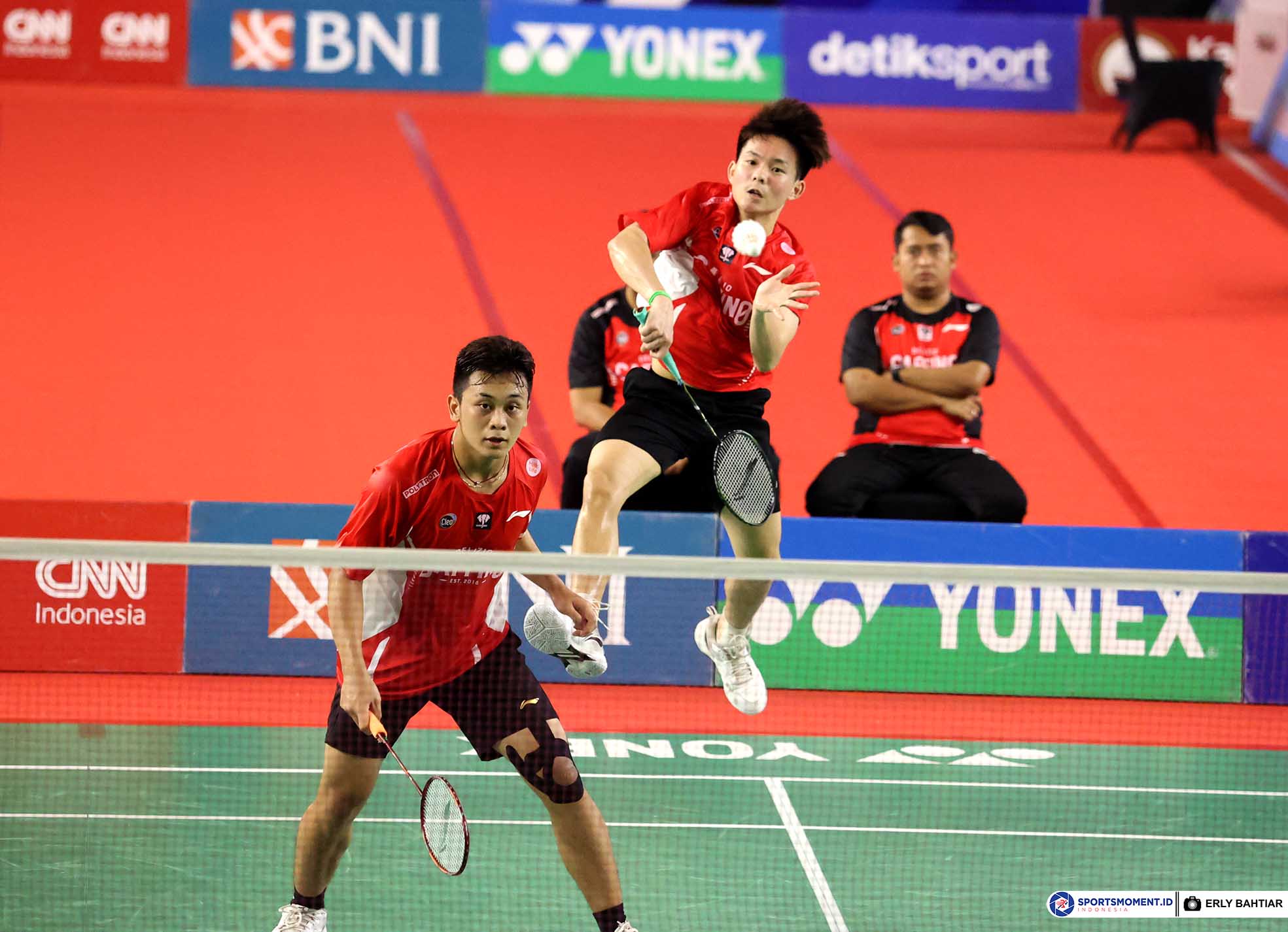 Emanuel Joseph Surya Hartono - Muhammad Voyage Afrisal Mahendra (Jawa Tengah) saat bertanding di Kejuaraan Bulutangkis PBSI Perorangan tahun 2023 yang berlansung di GOR UNJ, Jakarta pada 22 Desember 2023.