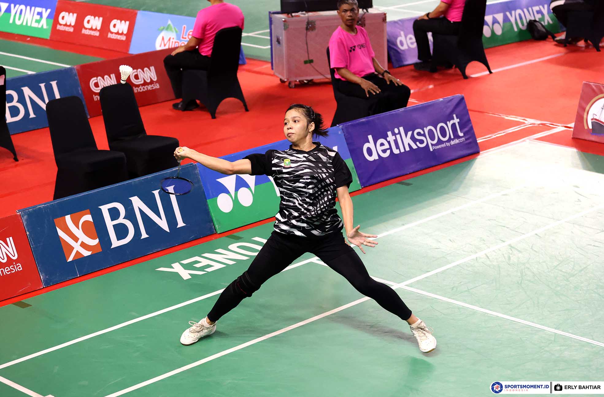 Laili Dwiyanti Nur Rohmah (DKI Jakarta) saat bertanding di Kejuaraan Bulutangkis PBSI Perorangan tahun 2023 yang berlansung di GOR UNJ, Jakarta pada 22 Desember 2023. Photo : Erly Bahtiar/Sportsmoment.id