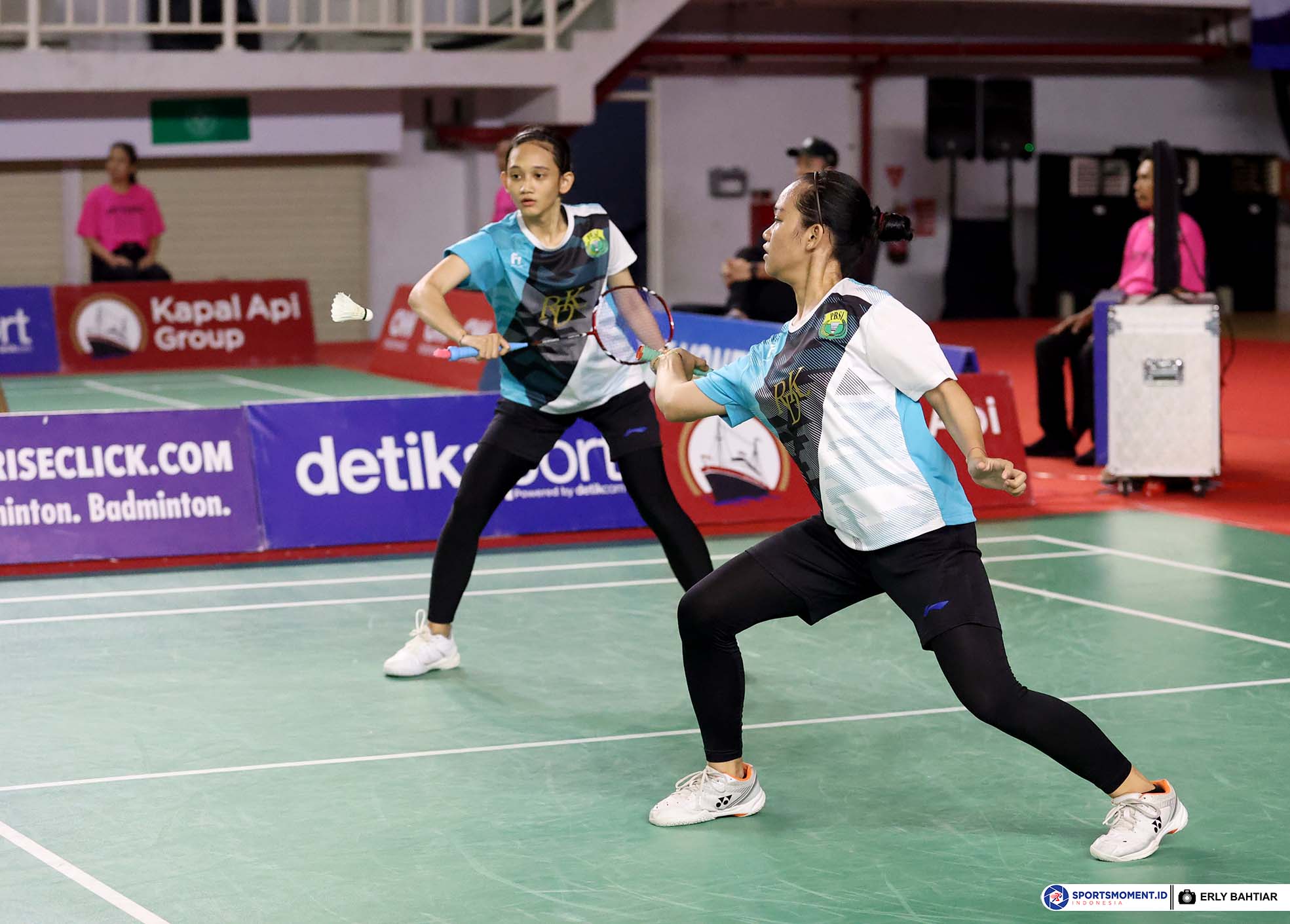 Mutia Dita Ainul Baroroh - Rista Berlian Maharani (Aceh) saat bertanding di Kejuaraan Bulutangkis PBSI Perorangan tahun 2023 yang berlansung di GOR UNJ, Jakarta pada 22 Desember 2023. Photo : Erly Bahtiar/Sportsmoment.id