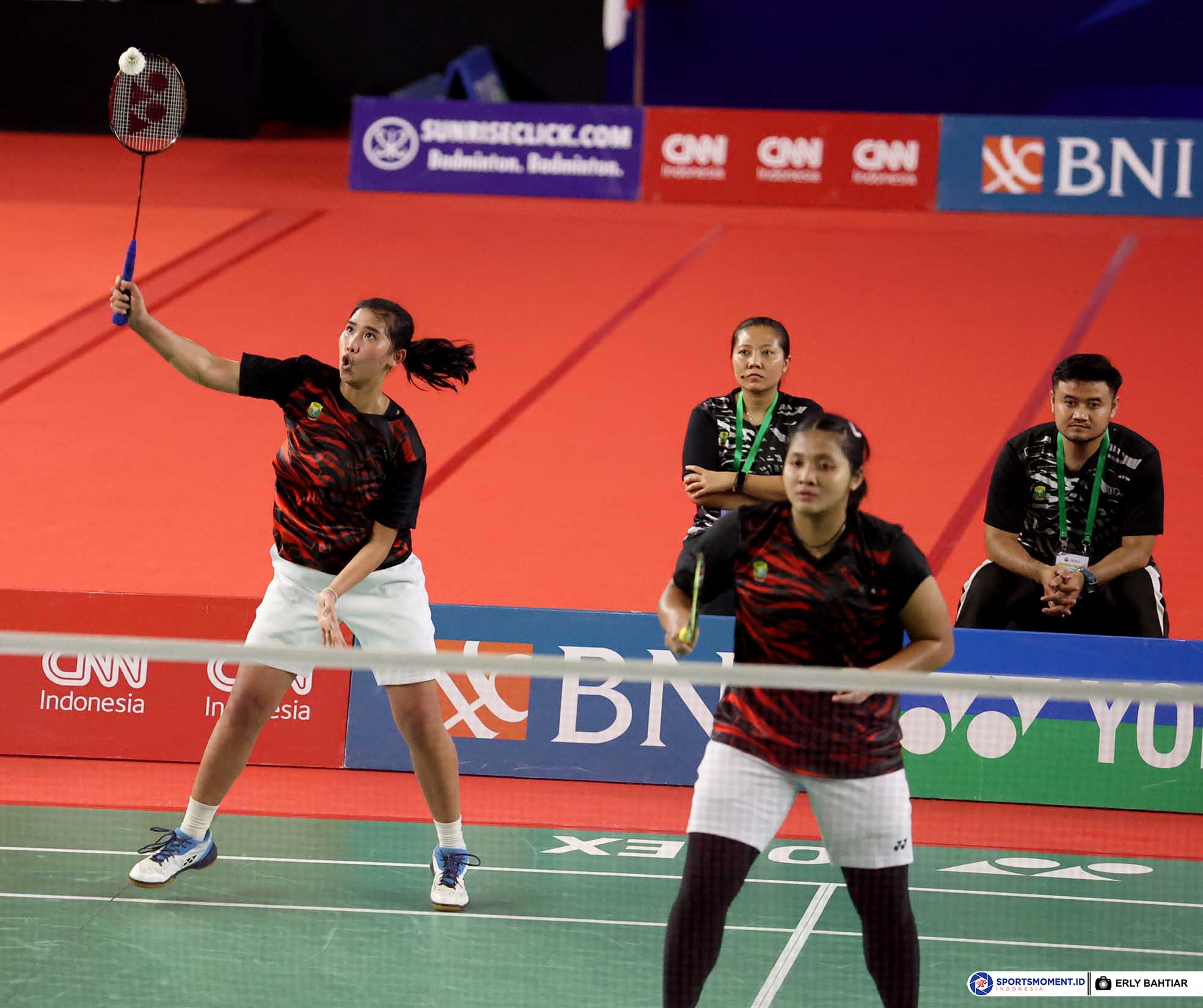 Nabila Cahya Permata Ayu - Reva Olivia Damayani (DKI Jakarta) saat bertanding di Kejuaraan Bulutangkis PBSI Perorangan tahun 2023 yang berlansung di GOR UNJ, Jakarta pada 22 Desember 2023. Photo : Erly Bahtiar/Sportsmoment.id