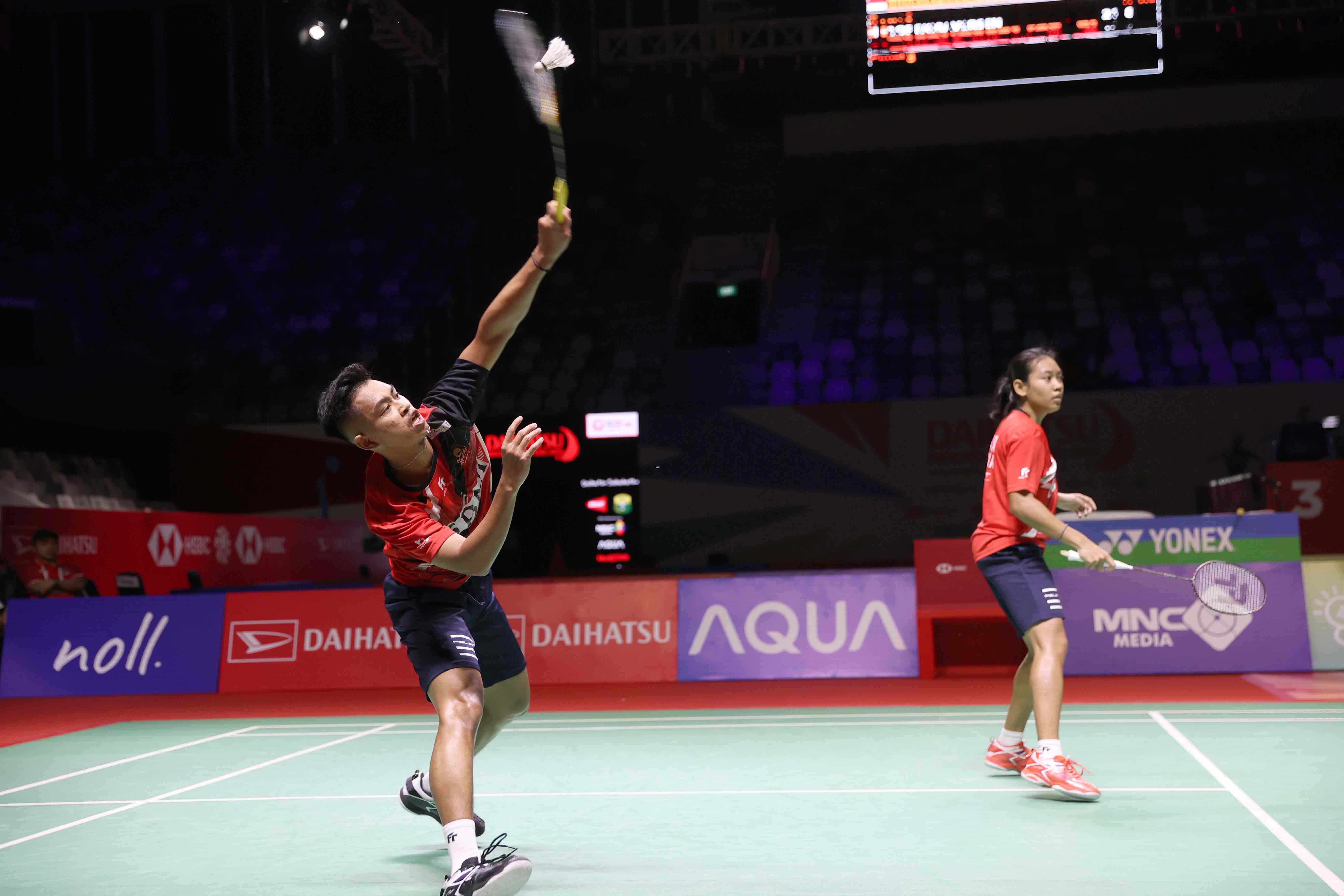Aisyah Salsabila Putri PRANATA (INA) pemain bulutangkis Indonesia di nomor ganda campuran saat bermain di turnamen bulu tangkis Daihatsu Indonesia Masters di Istora Senayan, pada Selasa, 23 Januari 2024.