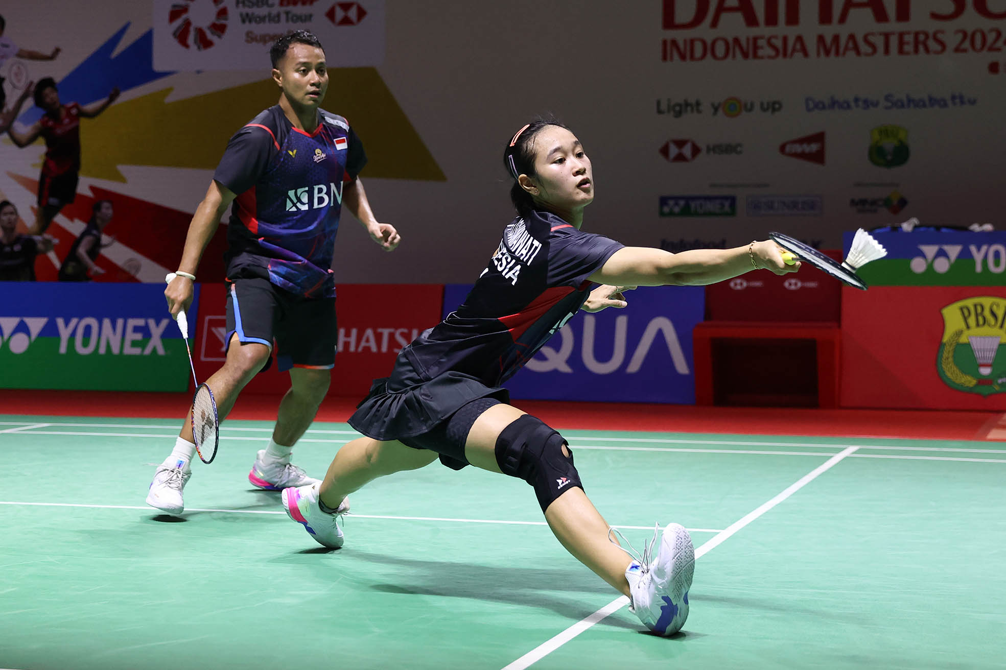 Ganda campuran Indonesia, Rehan Naufal Kusharjanto/Lisa Ayu Kusumawati berhasil mengalahkan ganda campuran Malaysia, Chen Tang Jie/Toh Ee Wei melalui pertarungan tiga gim, 12-21, 21-13 dan 21-14 pada babak 16 besar gelaran Daihatsu Indonesia Masters 2024, Kamis (25/1) di Istora Senayan Jakarta. (Foto : Humas PP PBSI)