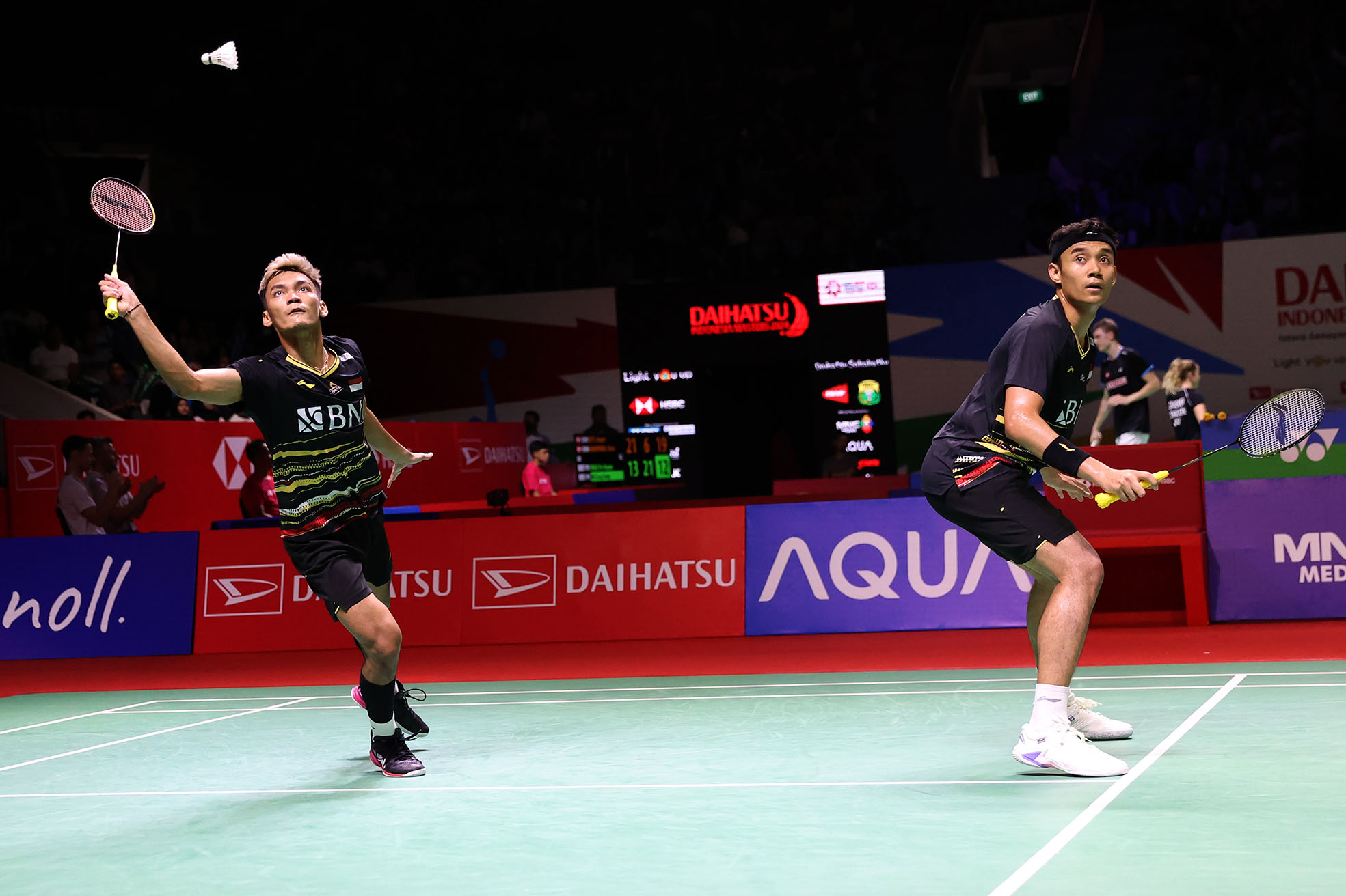 Ganda putra Indonesia, Muhammad Shohibul Fikri/Bagas Maulana berhasil melaju ke babak perempatfinal setelah mengalahkan ganda putra Jepang, Akira Koga/Taichi Saito dua gim langsung, 21-15, 21-18 pada babak 16 besar gelaran Daihatsu Indonesia Masters 2024, Kamis (25/1) di Istora Senayan Jakarta. (Foto : Humas PP PBSI )