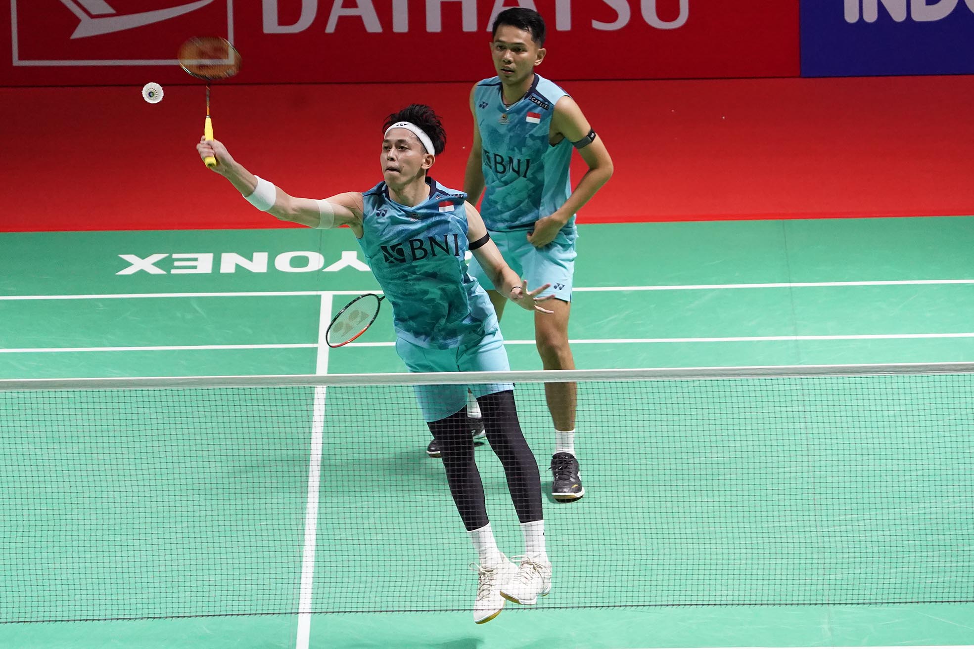 Ganda putra Indonesia, Fajar Alfian/Muhammad Rian Ardianto melangkah ke babak semifinal setelah mengalahkan kompatriotnya, Muhammad Shohibul Fikri/Bagas Maulana dua gim langsung, 21-13, 21-12 pada babak perempatfinal gelaran Daihatsu Indonesia Masters 2024, Jum'at (26/1) di Istora Senayan Jakarta. (Foto : Humas PP PBSI )