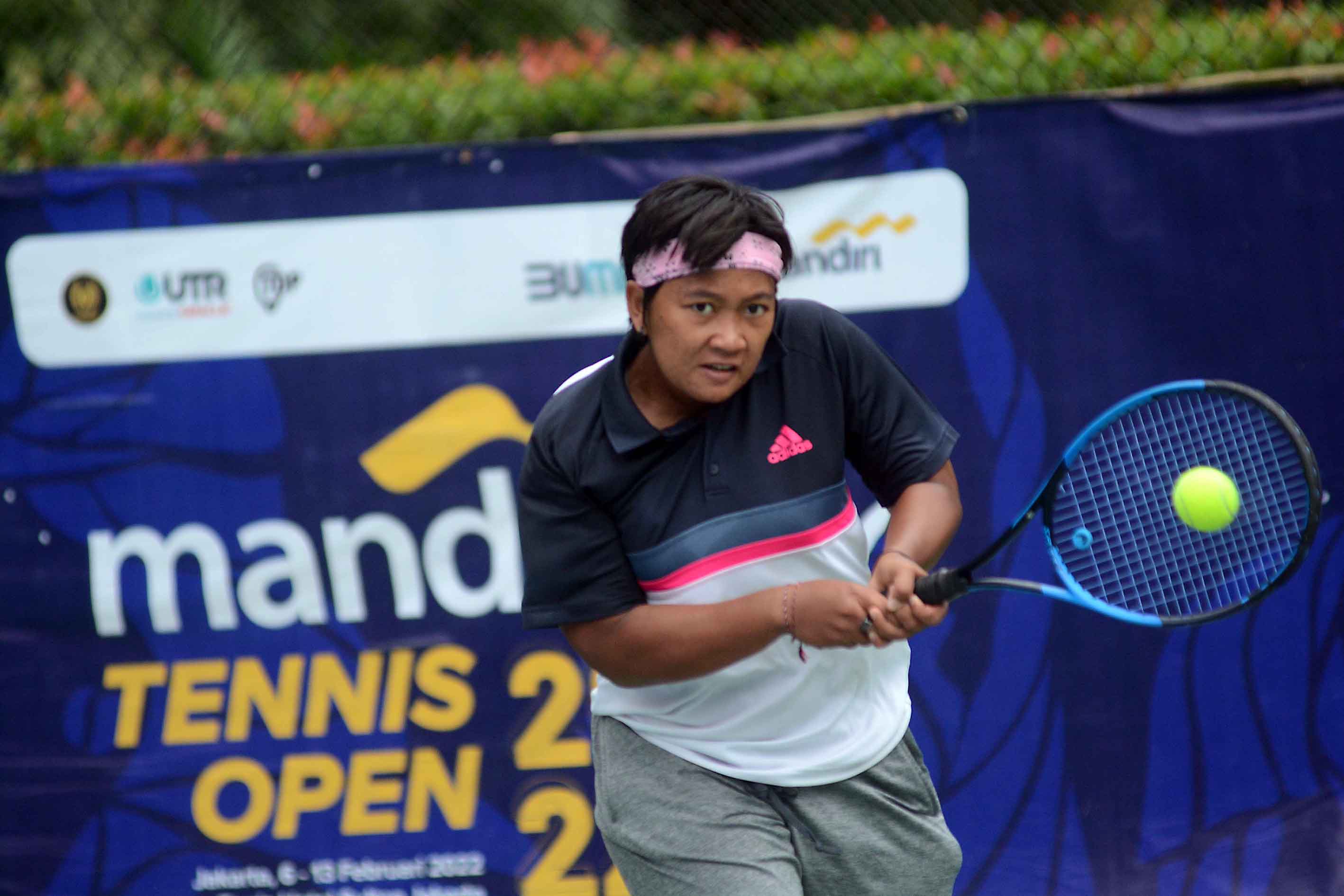 Petenis Kalimantan Selatan, Fadona Titalyanai dalam pertandingan babak Semi Final turnamen nasional Mandiri Tennis Open 2022 di lapangan tenis The Sultan Hotel & Residence Jakarta, Sabtu, 12 Februari 2022.