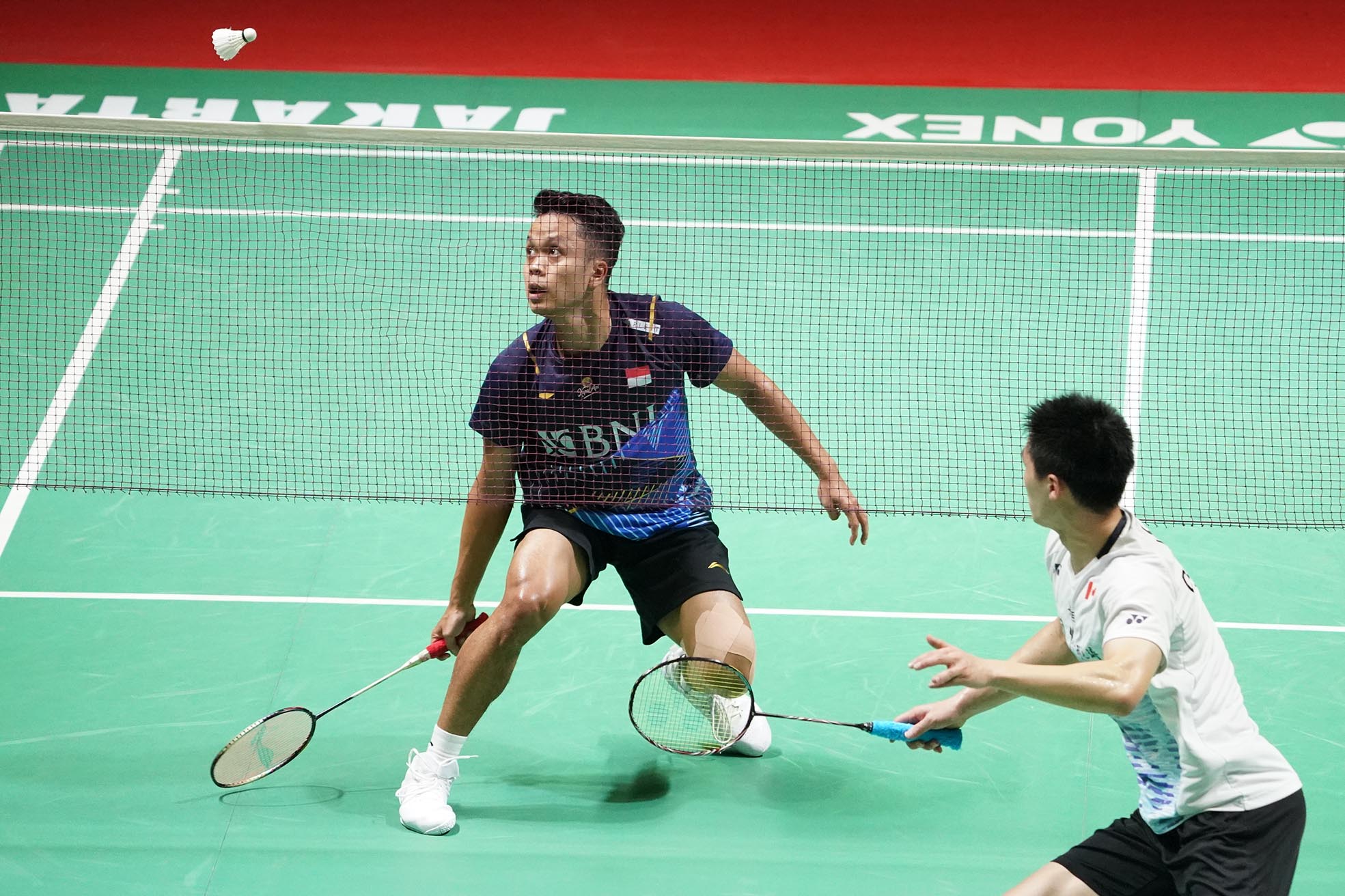Tunggal putra Indonesia, Anthony Sinisuka Ginting terhenti di babak semifinal setelah dikalahkan tunggal putra Kanada, Brian Yang melalui pertarungan ketat tiga gim, 21-13, 17-21 dan 19-21 pada gelaran Daihatsu Indonesia Masters 2024, Sabtu (27/1) di Istora Senayan Jakarta. (Foto : Humas PP PBSI )