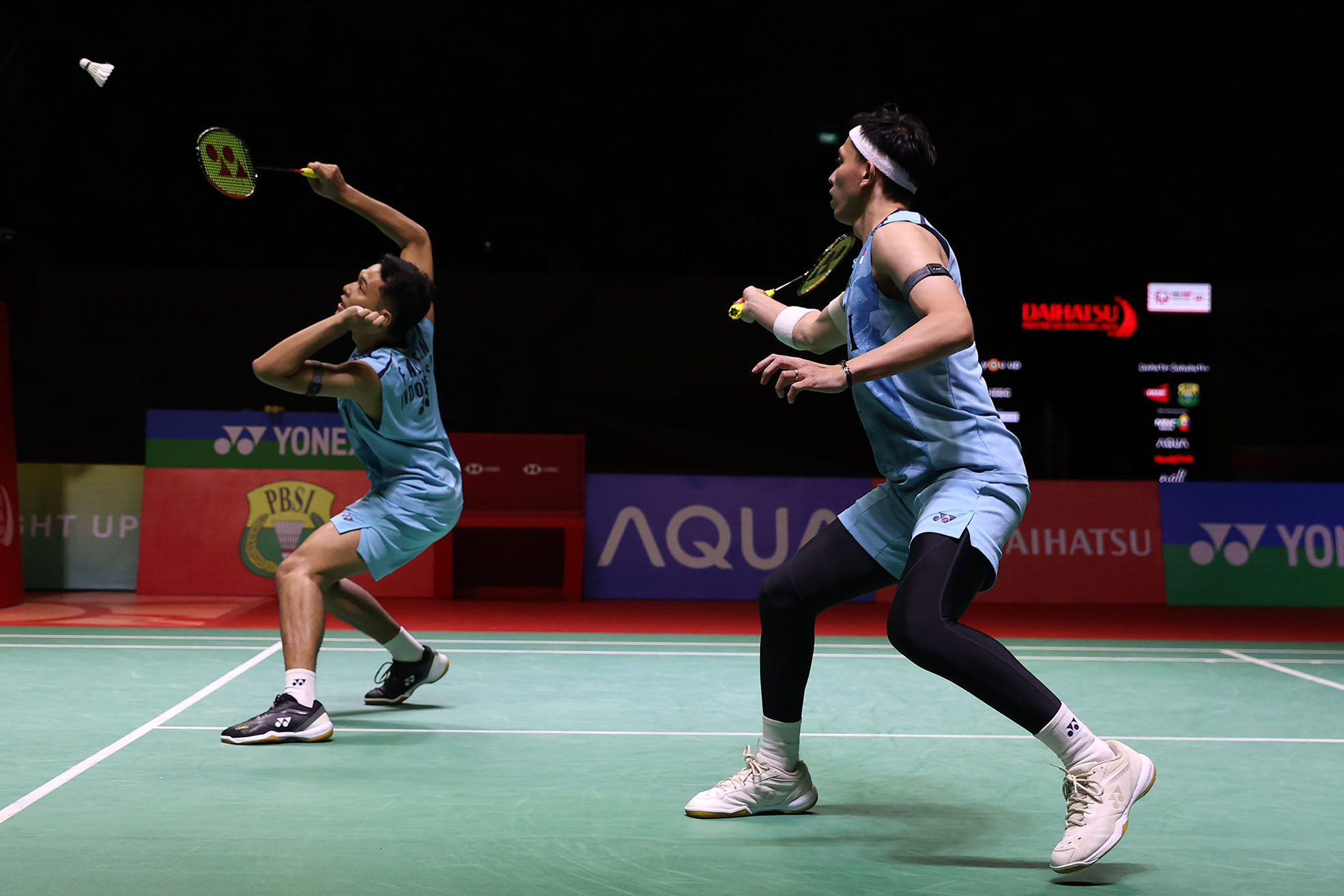 Ganda putra Indonesia, Fajar Alfian/Muhammad Rian Ardianto terhenti di babak semifinal setelah dikalahkan kompatriotnya, Leo Rolly Carnando/Daniel Marthin melalui pertarungan ketat tiga gim, 21-19, 14-21 dan 17-21 pada gelaran Daihatsu Indonesia Masters 2024, Sabtu (27/1) di Istora Senayan Jakarta. (Foto : Humas PP PBSI )