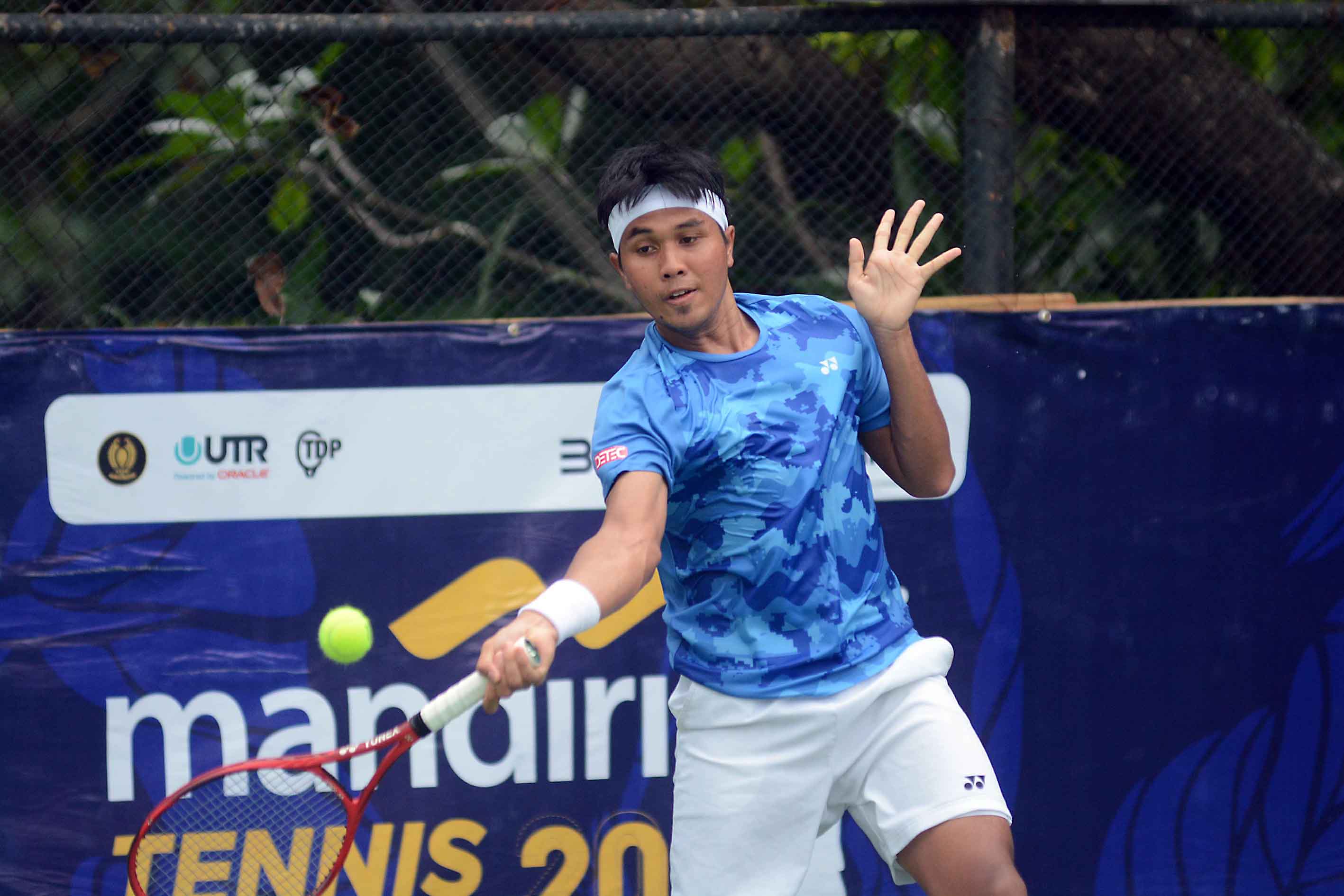 Petenis Jawa Timur, M. Rifqi Fitriadi dalam pertandingan babak Semi Final turnamen nasional Mandiri Tennis Open 2022 di lapangan tenis The Sultan Hotel & Residence Jakarta, Sabtu, 12 Februari 2022.