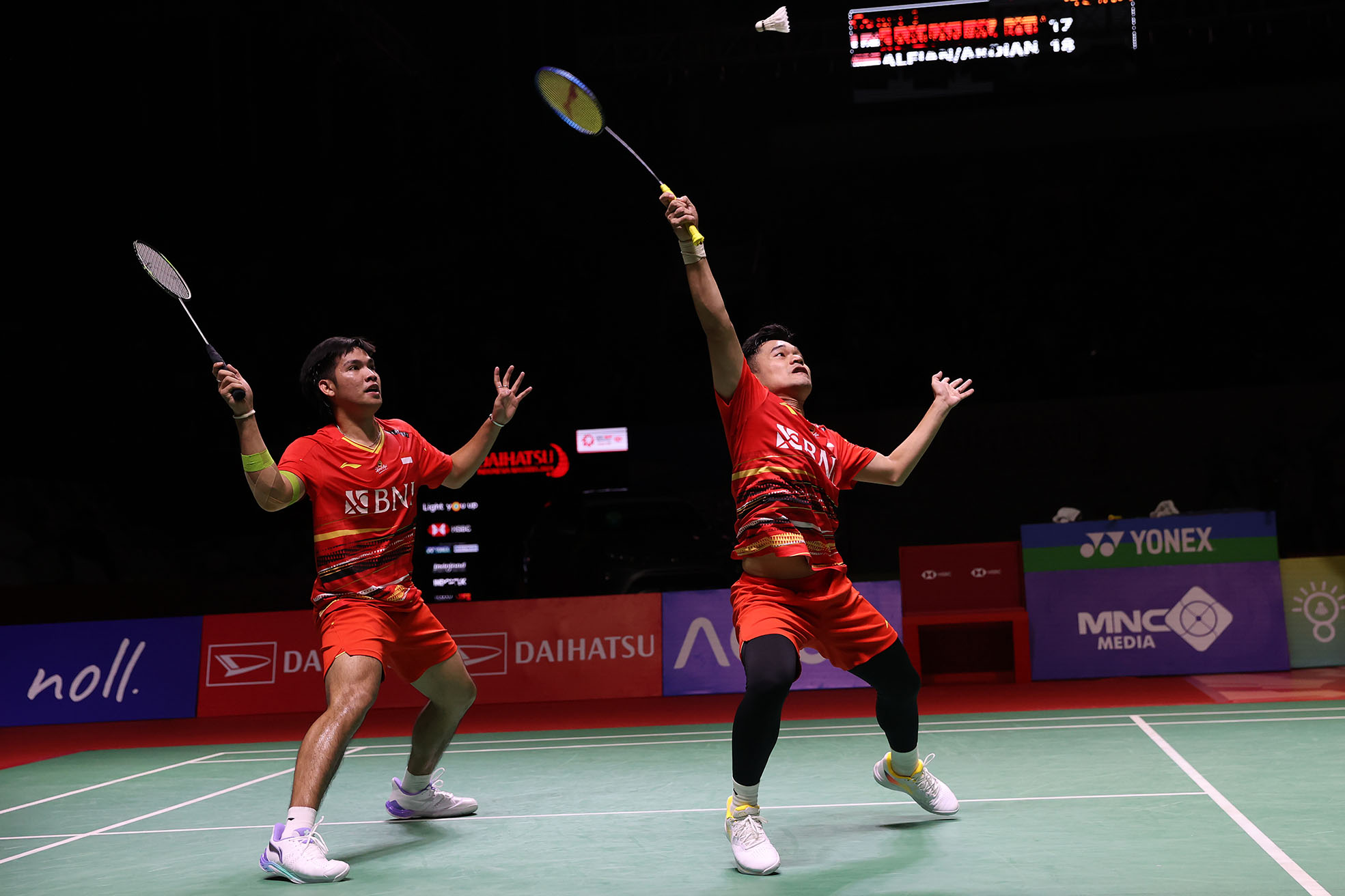 Ganda putra Indonesia, Leo Rolly Carnando/Daniel Marthin berhasil melangkah ke partai final setelah mengalahkan kompatriotnya, Fajar Alfian/Muhammad Rian Ardianto melalui pertarungan ketat tiga gim, 19-21, 21-14 dan 21-17 pada babak semifinal gelaran Daihatsu Indonesia Masters 2024, Sabtu (27/1) di Istora Senayan Jakarta. (Foto : Humas PP PBSI )
