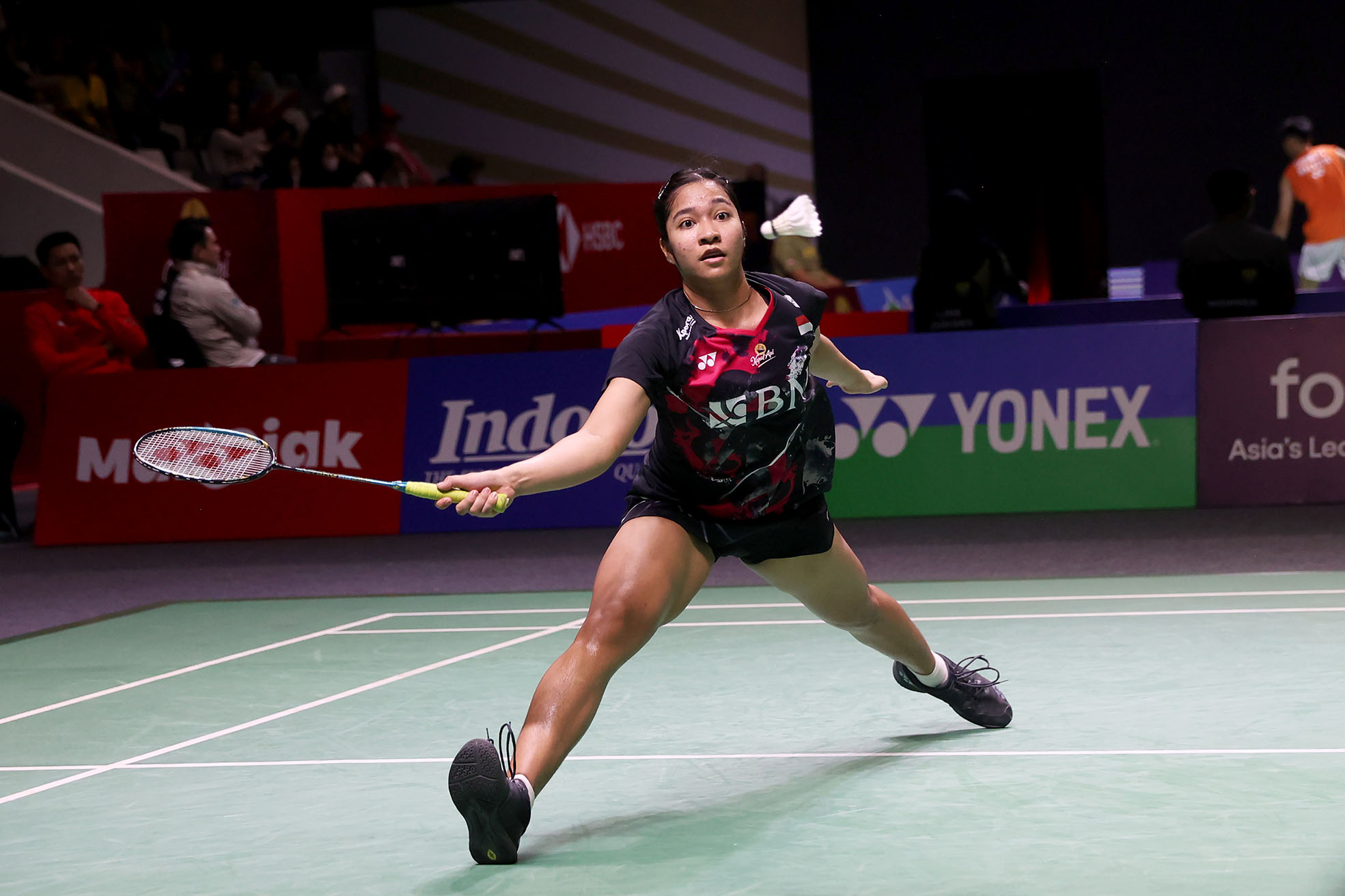 Tunggal putri Indonesia, Ester Nurumi Tri Wardoyo berhasil melaju ke babak kedua setelah berhasil mengalahkan tunggal putri Jepang, Nozomi Okuhara dua gim langsung 21-17, 21-16 pada babak pertama gelaran Kapal Api Indonesia Open 2024 di Istora Senayan Jakarta, Selasa (4/6). (Photo by : Humas PP PBSI/sportsmoment.id)