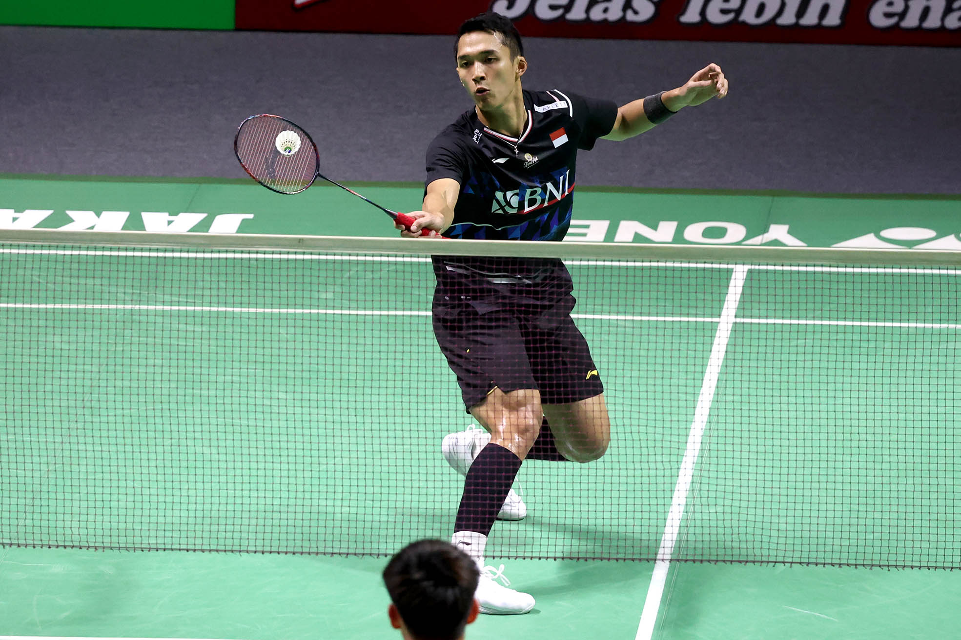 Tunggal putra Indonesia, Jonatan Christie terhenti di babak pertama setelah dikalahkan tunggal putra asal Malaysia, Leong Jun Hao melalui pertarungan tiga gim 13-21, 21-16, 12-21 pada gelaran Kapal Api Indonesia Open 2024 di Istora Senayan Jakarta, Rabu (5/6). (Photo by : Humas PP PBSI/sportsmoment.id)
