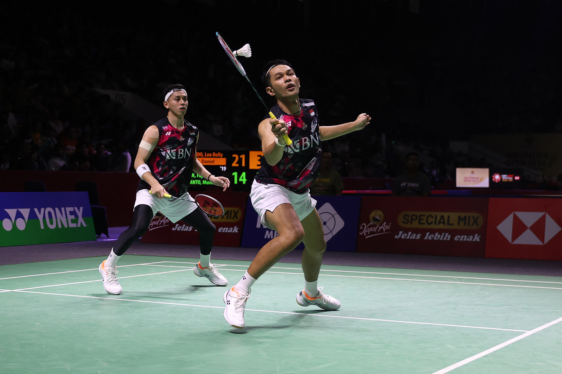 Ganda putra Indonesia, Fajar Alfian/Muhammad Rian Ardianto terhenti di babak pertama setelah dikalahkan kompatriotnya, Leo Rolly Carnando/Daniel Marthin dua gim langsung 14-21, 17-21 pada gelaran Kapal Api Indonesia Open 2024 di Istora Senayan Jakarta, Rabu (5/6). (Photo by : Humas PP PBSI/sportsmoment.id)