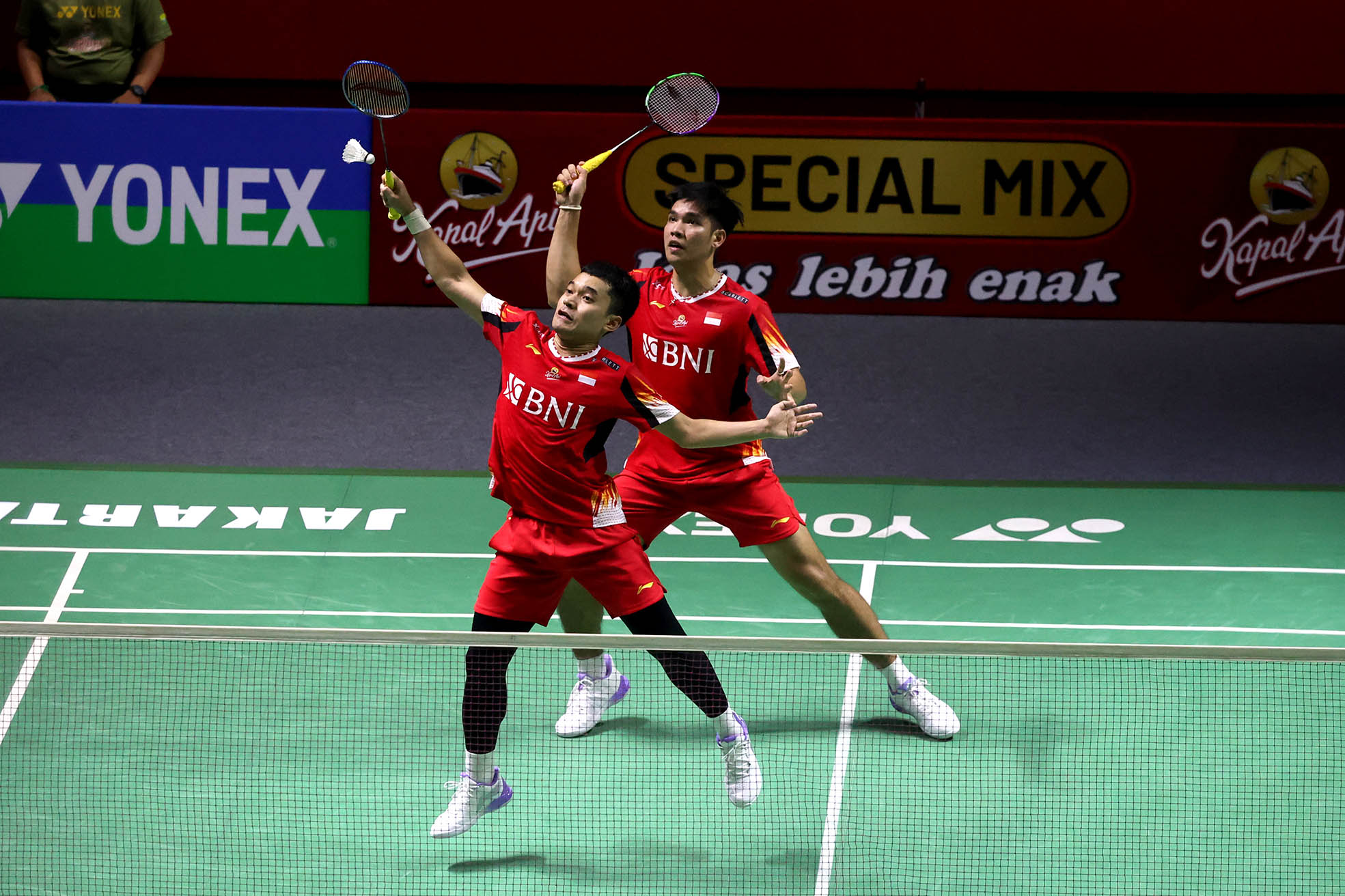 Ganda putra Indonesia, Leo Rolly Carnando/Daniel Marthin terhenti di babak kedua setelah dikalahkan ganda putra Malaysia, Goh Sze Fei/Nur Izzuddin melalui pertarungan tiga gim, 21-16, 16-21, 12-21 pada gelaran Kapal Api Indonesia Open 2024 di Istora Senayan Jakarta, Kamis (6/6). (Photo by : Humas PP PBSI/sportsmoment.id)