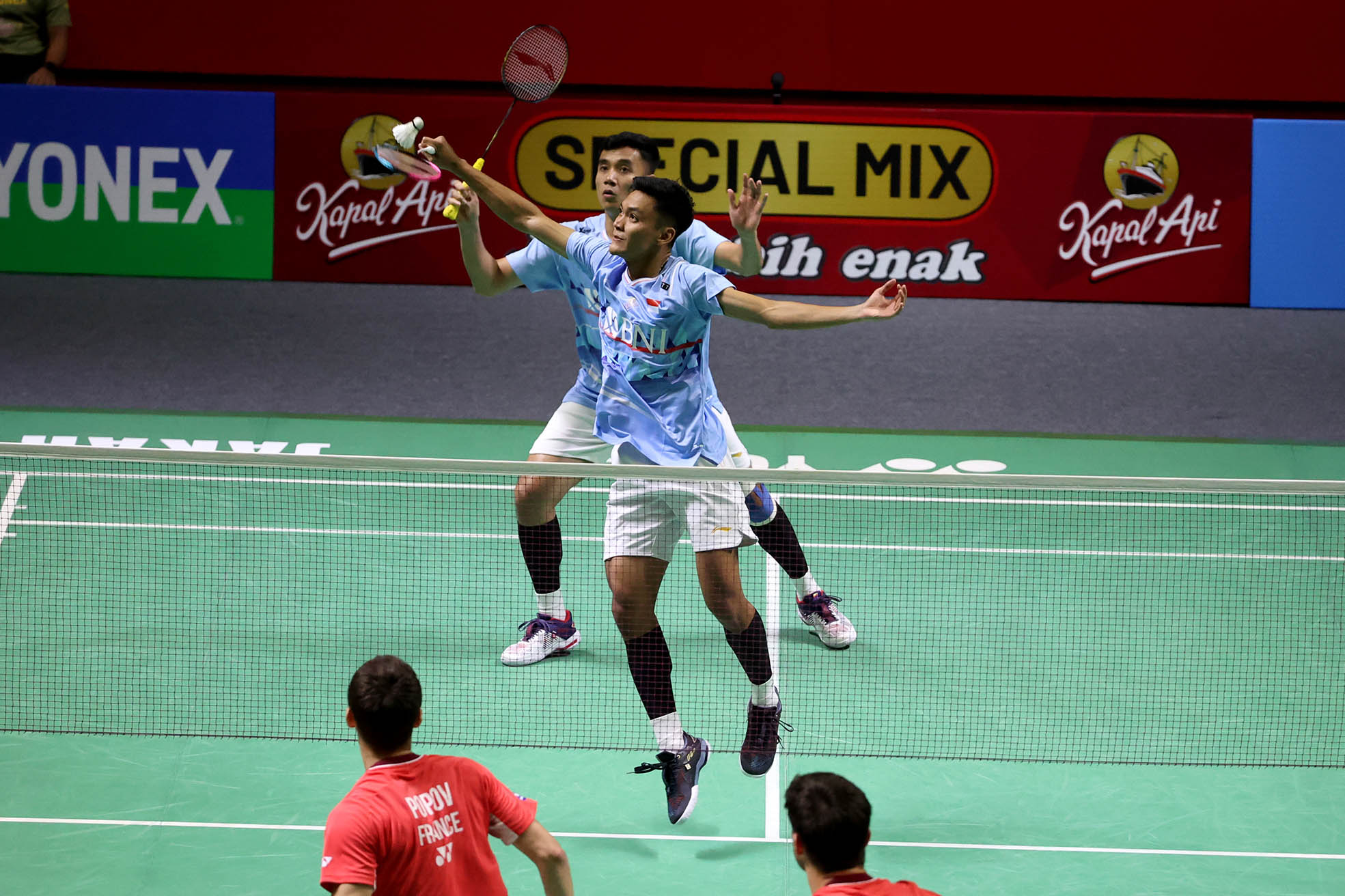 Ganda putra Indonesia, Muhammad Shohibul Fikri/Bagas Maulana berhasil melangkah ke babak perempatfinal setelah mengalahkan ganda putra Perancis, Christo Popov/Toma Junior Popov dua gim langsung, 21-11, 21-17 pada gelaran Kapal Api Indonesia Open 2024 di Istora Senayan Jakarta, Kamis (6/6). (Photo by : Humas PP PBSI/sportsmoment.id)