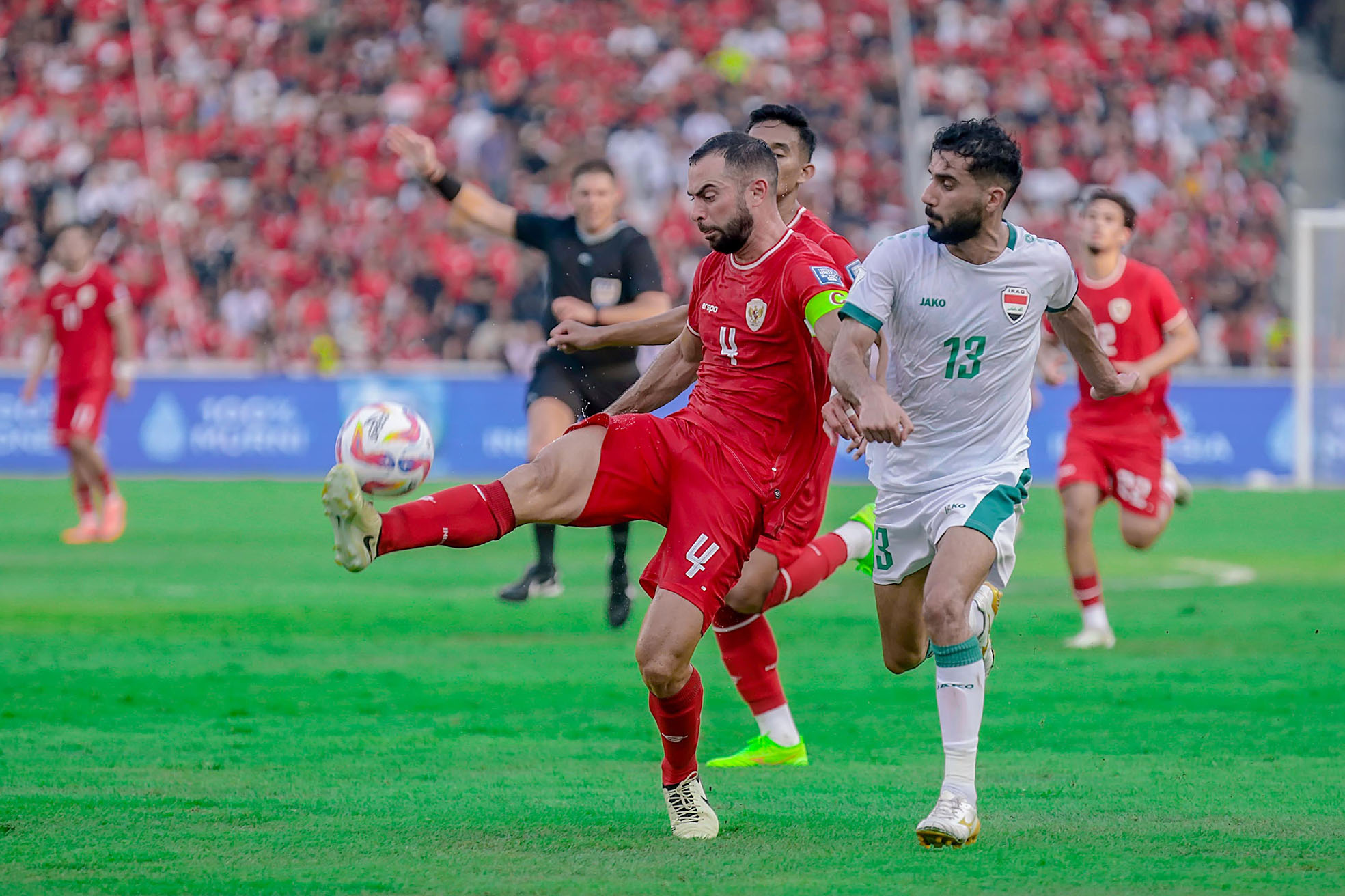 Pemain Tim Nasional Indonesia, Jordi Amat (4) berebut bola dengan pemain Irak, BAshar Resan Bonyan (13) pada pertandingan kualifikasi Piala Dunia 2026 Indonesia vs Irak, Kamis 6 Juni 2024 di Stadion Utama Gelora Bung Karno.