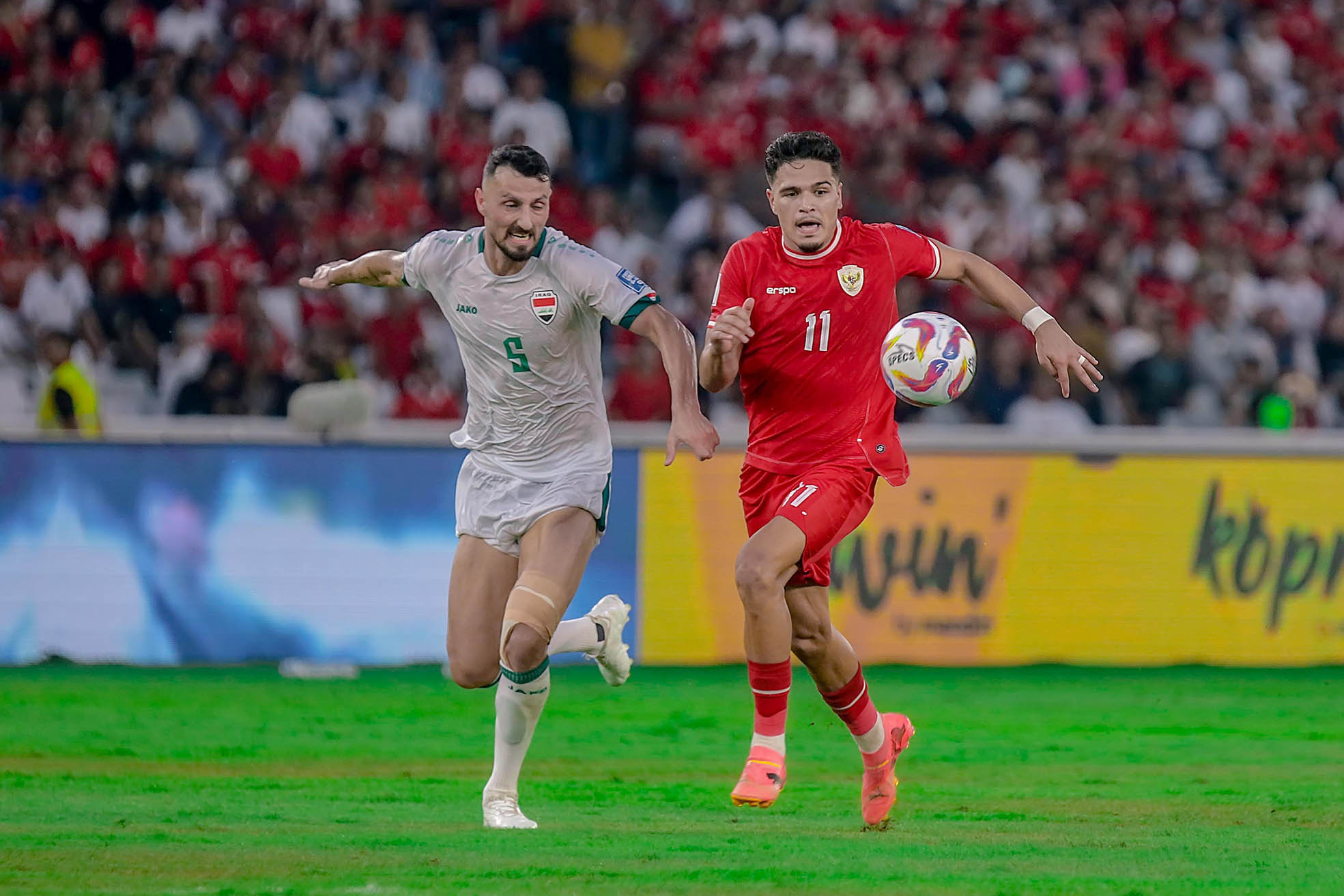 Pemain Tim Nasional Indonesia, Ragnar Oeratmangoen (11) berebut bola dengan pemain Irak, Rebin Ghareeb Adhamat (5 ) pada pertandingan kualifikasi Piala Dunia 2026 Indonesia vs Irak, Kamis 6 Juni 2024 di Stadion Utama Gelora Bung Karno.