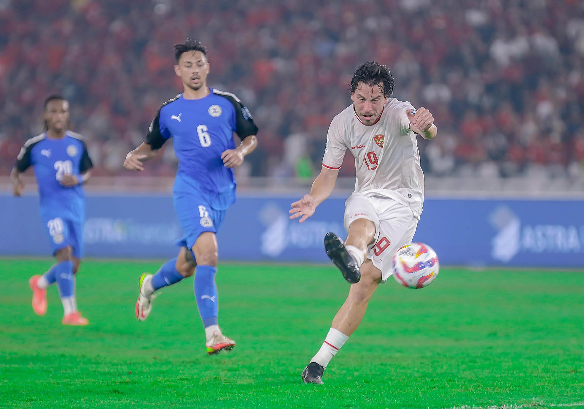 Pemain IndonesaThom Haye (19) melepaskan tendangan yang berbuah gol pada pertandingan kualifikasi Piala Dunia 2026 Indonesia vs Filipina, Selasa 11 Juni 2024 di Stadion Utama Gelora Bung Karno.,