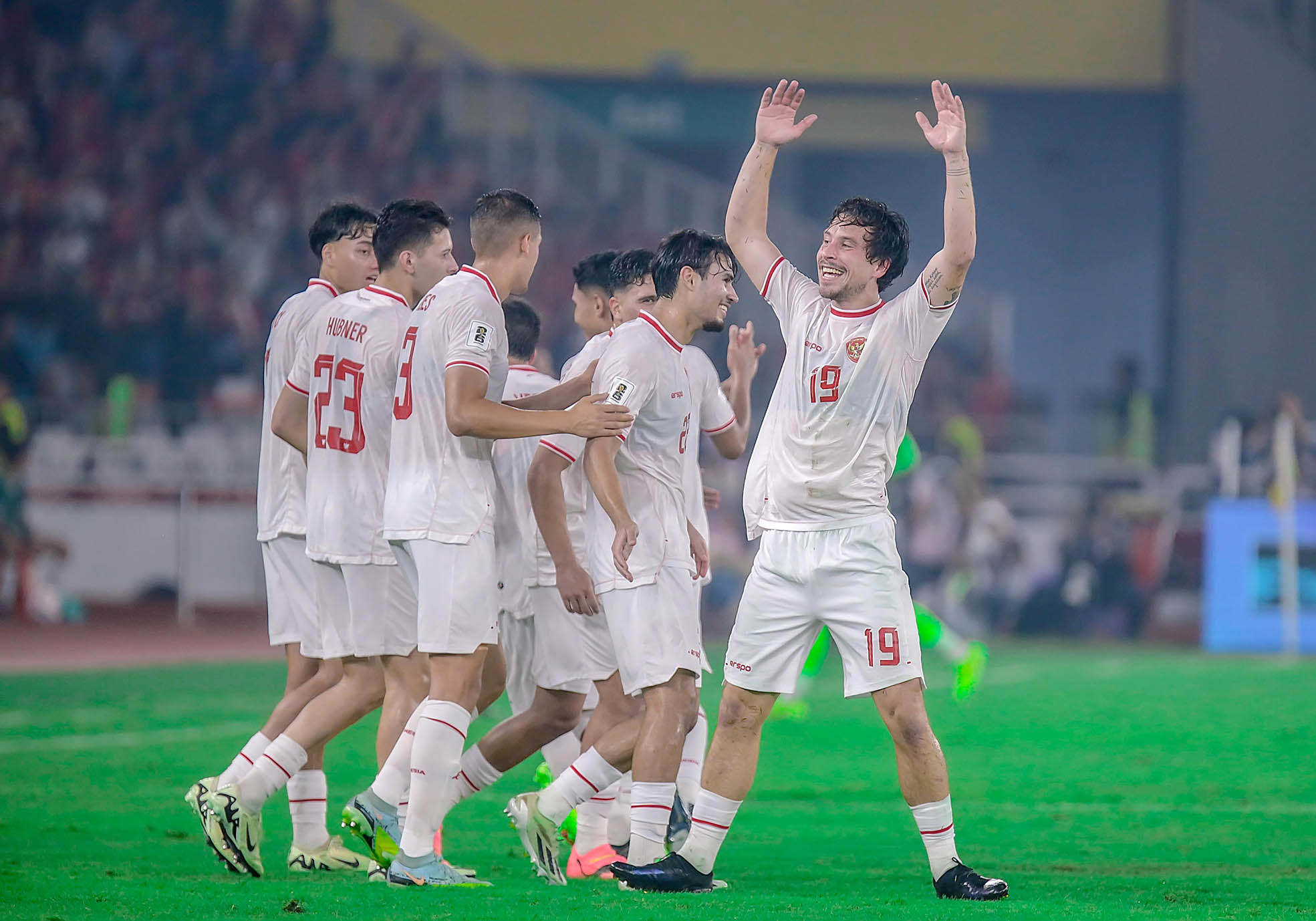 Pemain IndonesaThom Haye (19) merayakan gol kedua Indonesia pada pertandingan kualifikasi Piala Dunia 2026 Indonesia vs Filipina, Selasa 11 Juni 2024 di Stadion Utama Gelora Bung Karno.