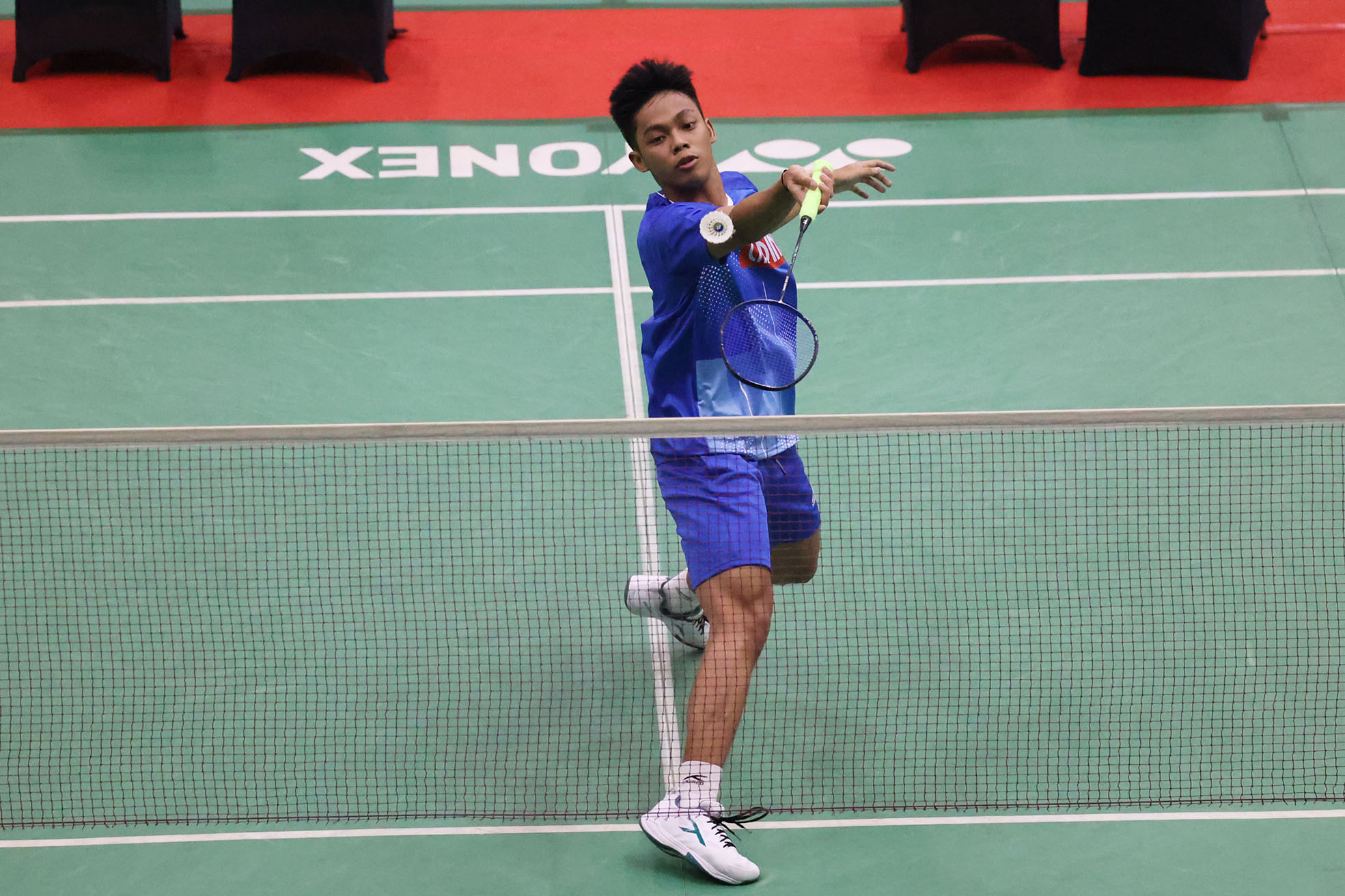 Faisal Muhammad Fikri pada laga perdana gelaran YONEX Sunrise Pembangunan Jaya Raya Junior International Grand Prix 2024 yang berlangsung di GOR PB Jaya Raya Bintaro, Selasa (9/7).