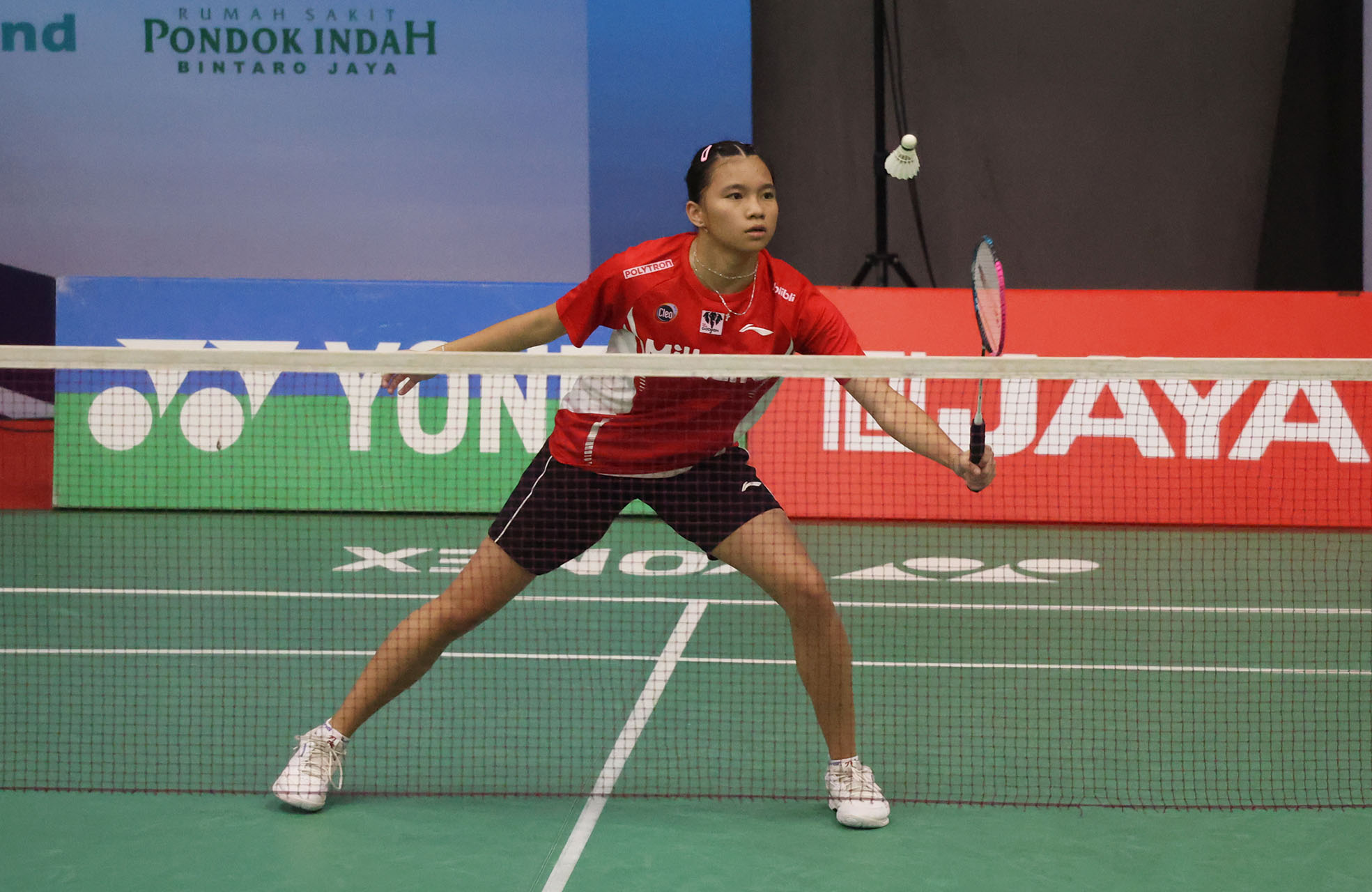 Victoria Grace Matriksa pada laga perdana gelaran YONEX Sunrise Pembangunan Jaya Raya Junior International Grand Prix 2024 yang berlangsung di GOR PB Jaya Raya Bintaro, Selasa (9/7).