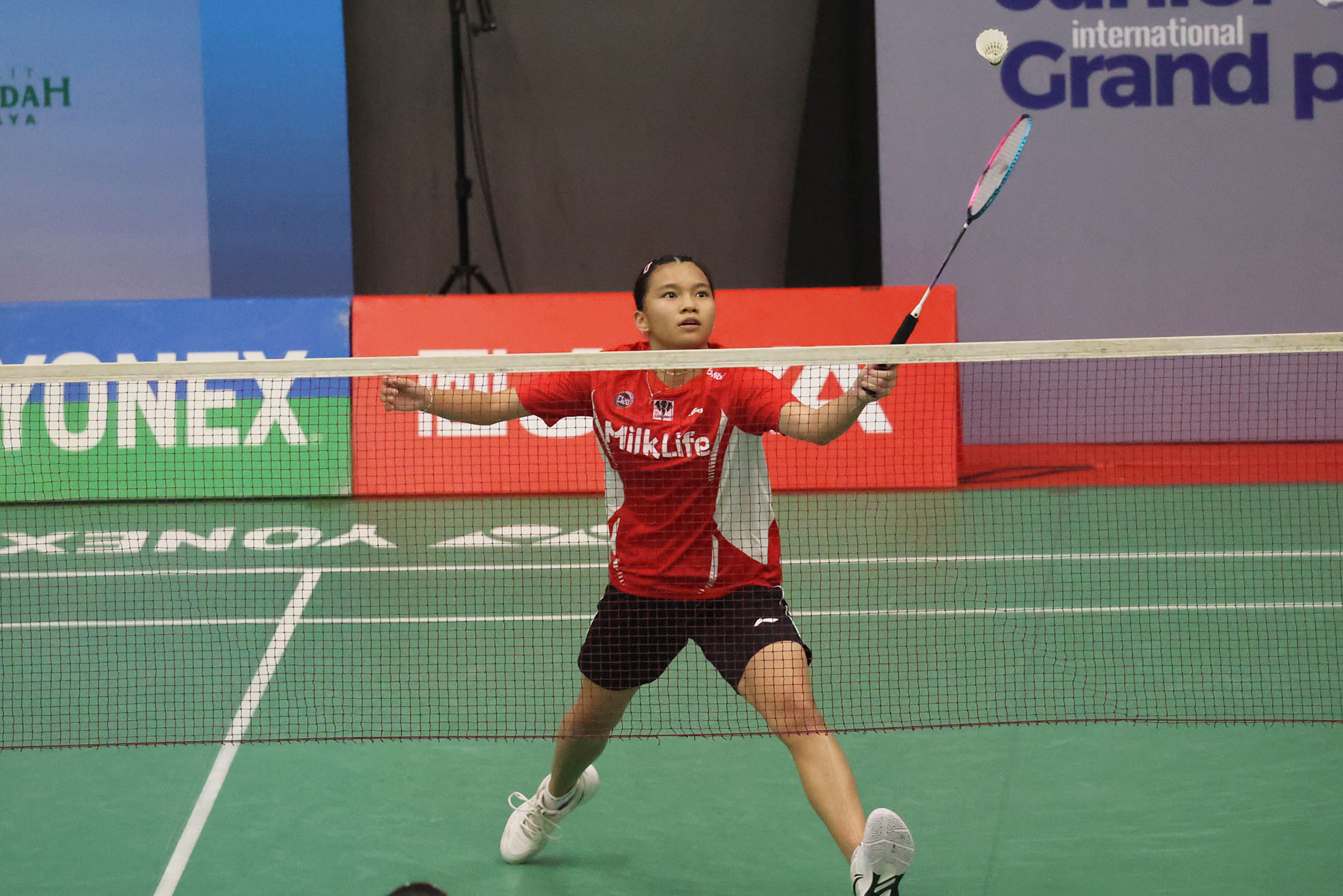 Victoria Grace Matriksa pada laga perdana gelaran YONEX Sunrise Pembangunan Jaya Raya Junior International Grand Prix 2024 yang berlangsung di GOR PB Jaya Raya Bintaro, Selasa (9/7).